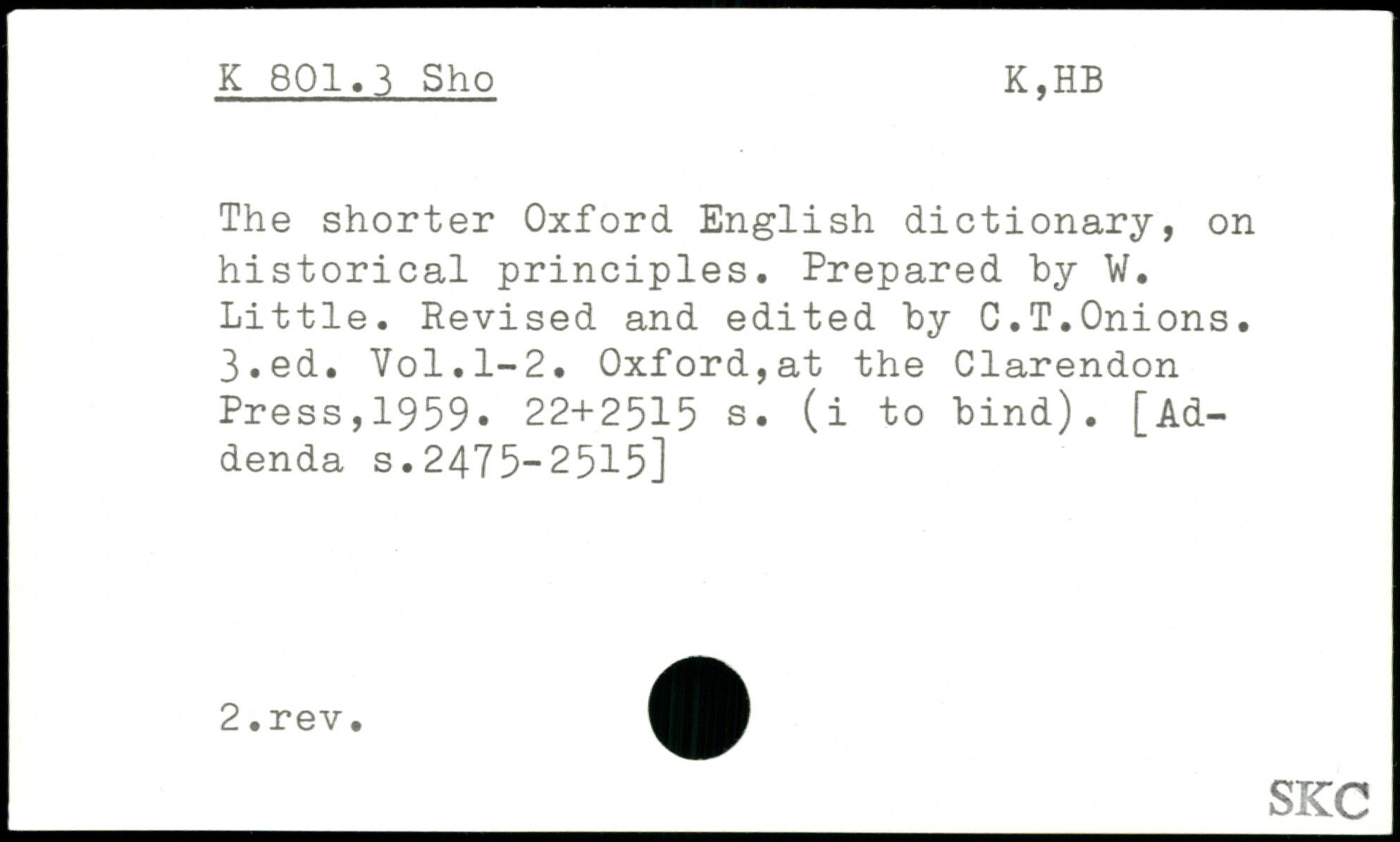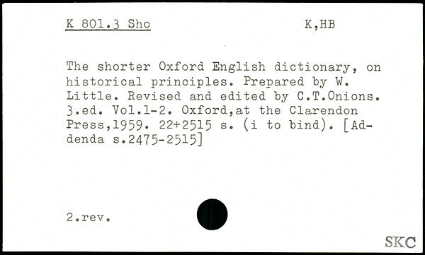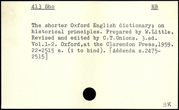 The shorter Oxford English dictionary, on historical principles. Prepared by W. Little. Revised and edited by C.T.Onions.