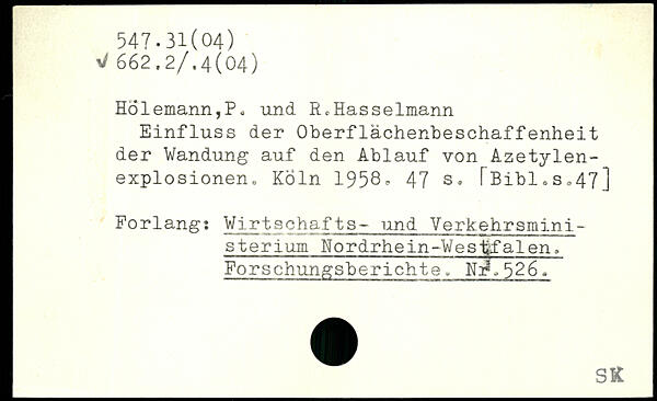 Holemann,P, und RcHasselmann Einfluss der Oberflächenbeschaffenheit der Wandung auf den Ablauf von Azetylenexplosionen,