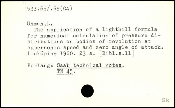 The application of a Lighthill formula for numerical calculation of pressure distributions on bodies of revolution at supersonic speed and zero angle of attack. Linköping 1960.