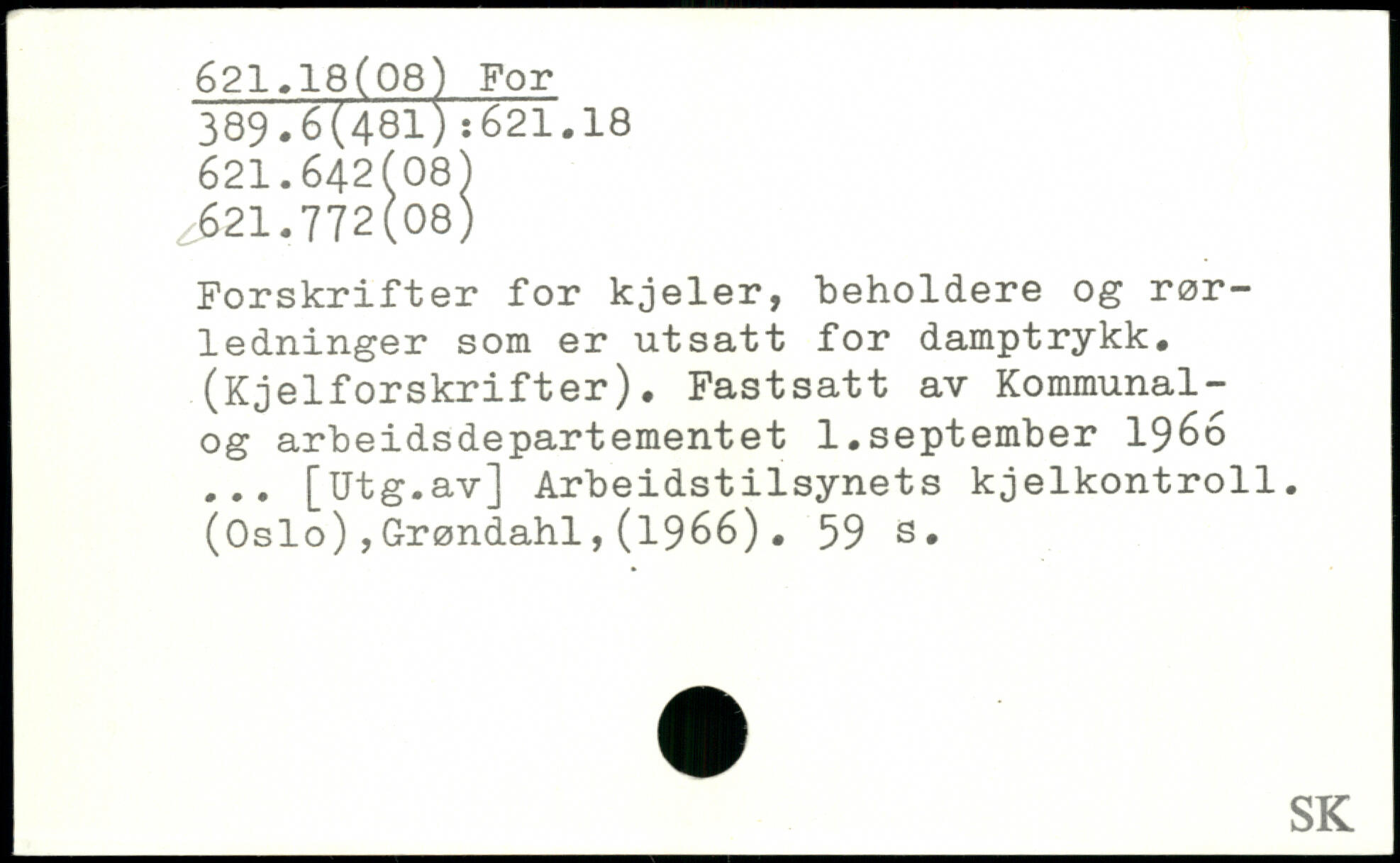 Forskrifter for kjeler, beholdere og rørledninger som er utsatt for damptrykk. (Kjelforskrifter). Fastsatt av Kommunal-og arbeidsdepartementet 1.september 1966 ... [Utg.av] Arbeidstilsynets kjelkontroll. (Oslo),Grøndahl,(1966).