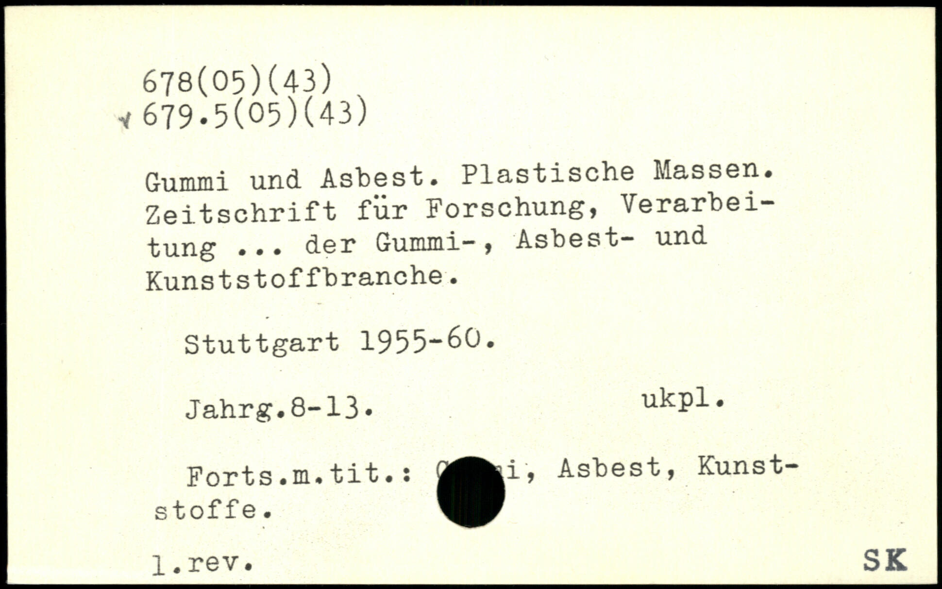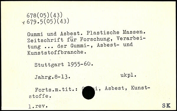 Gummi und Asbest. Plastische Massen. Zeitschrift für Forschung, Verarbeitung ... der Gummi—, Asbest— und Kunststoffbranche.