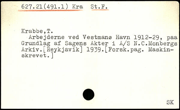 Arbejderne ved Vestmanø Havn 1912-29, paa Grundlag af Sagens Akter i A/S N.C.Monbergs Arkiv.[Reykjavik] 1939.[Rorsk.pag. Maskinskrevet. ]