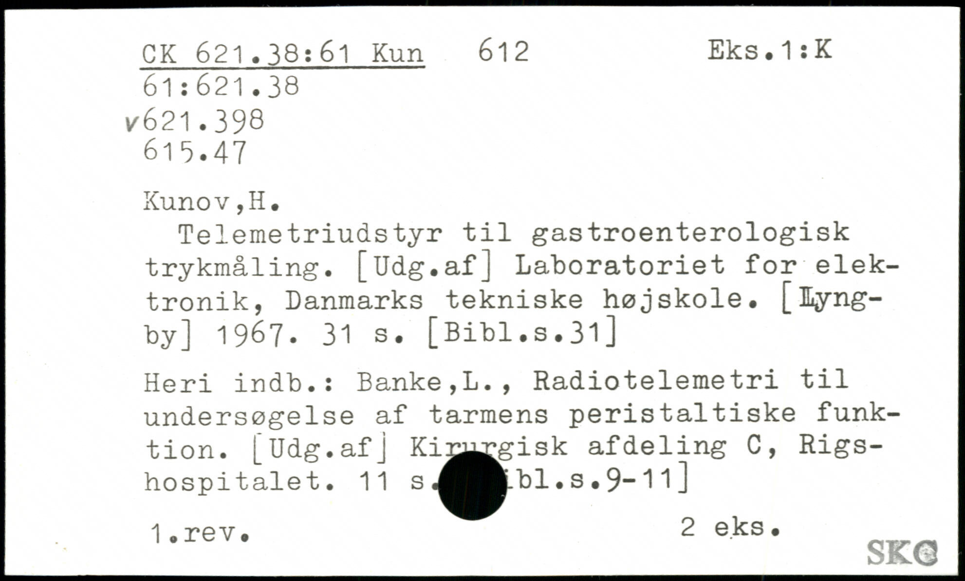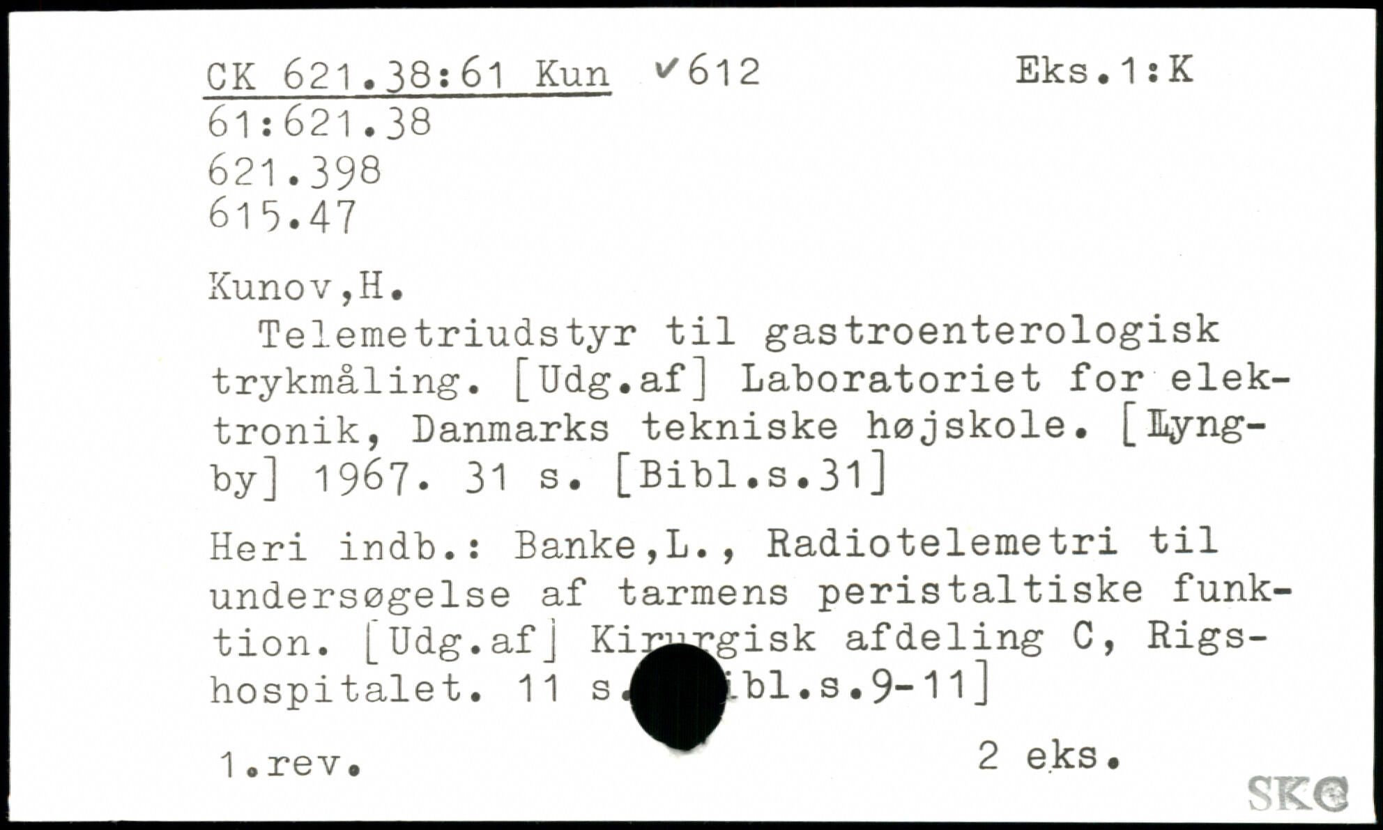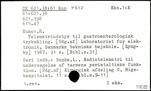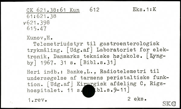 Telemetriudstyr til gastroenterologisk trykmåling. [Udg.af] Laboratoriet for elektronik, Danmarks tekniske højskole. [Lyngby] 1967.