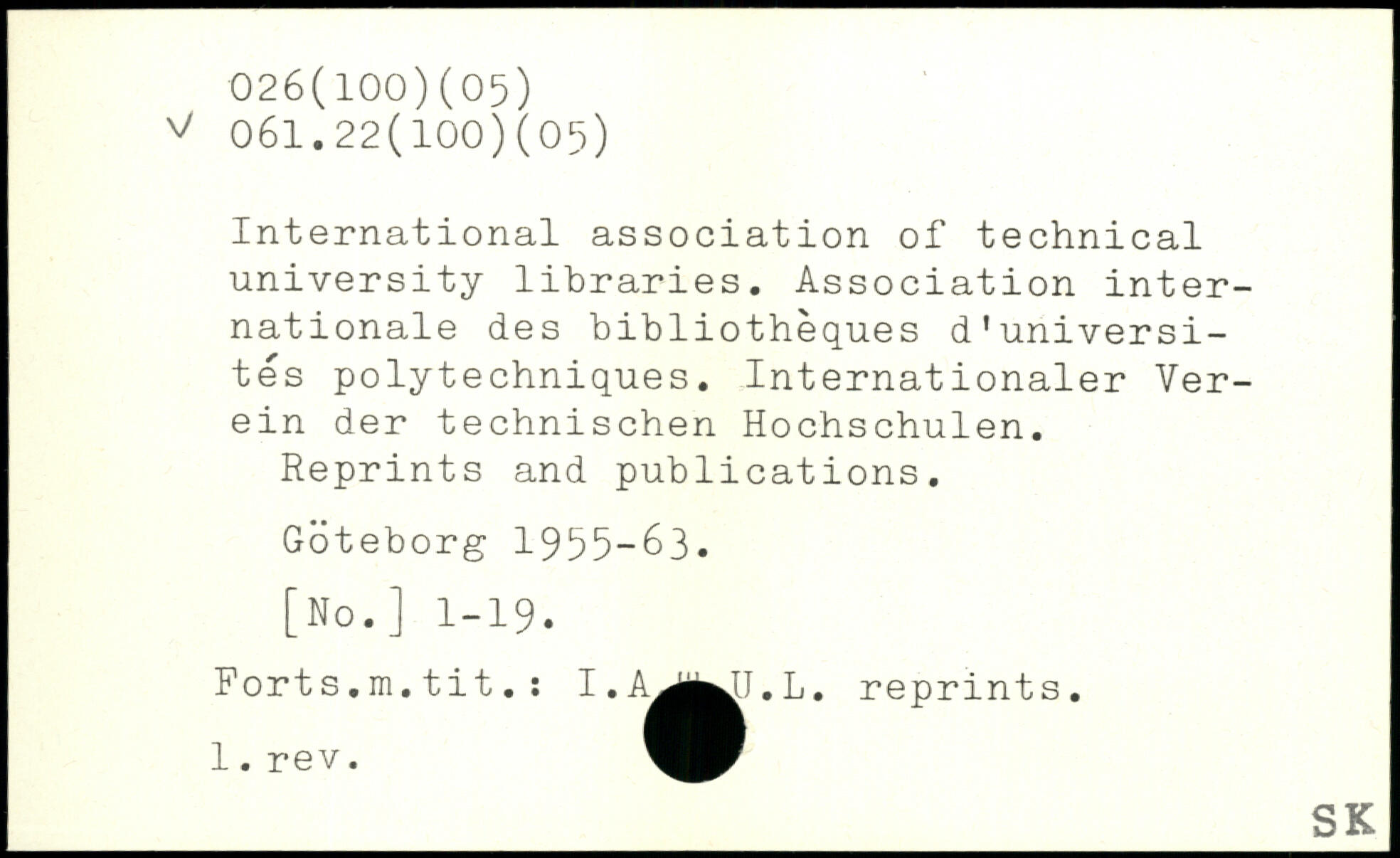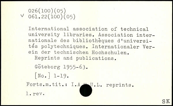 International association of technical university libraries. Association internationale des bibliothèques d'universités polytechniques. Internationaler Verein der technischen Hochschulen. Reprints and publications. Göteborg 1955-63. [No.] 1-19. Forts.m.tit. : I.A^j^J.L. reprints.