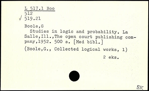 Studies in logic and probability. La Salle,111.,The open court publishing company, 1952.