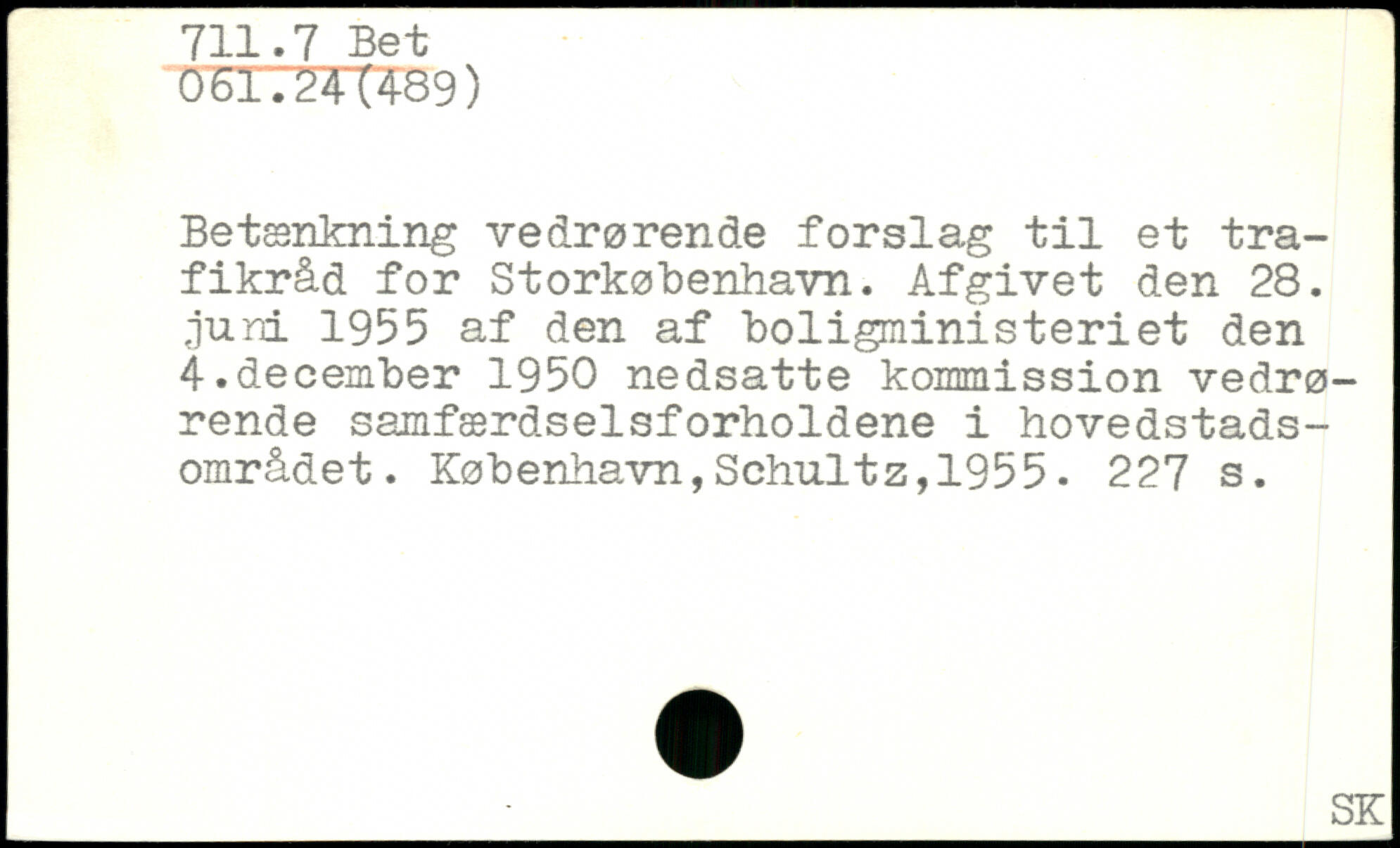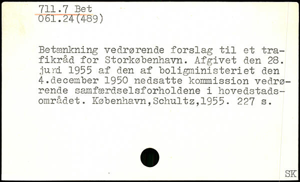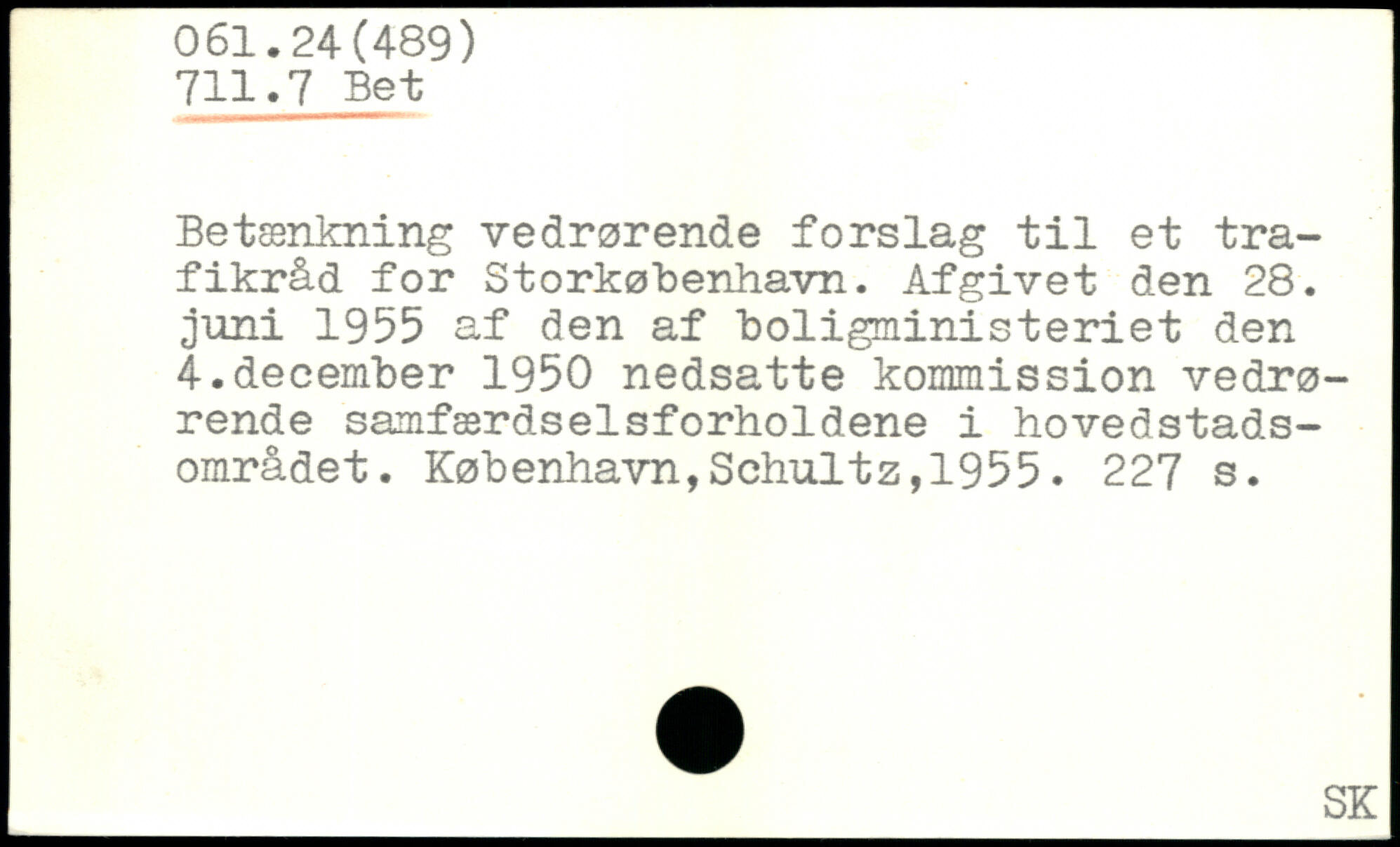 Betænkning vedrørende forslag til et trafikråd for Storkøbenhavn. Afgivet den 28. juni 1955 af den af boligministeriet den 4.december 1950 nedsatte kommission vedrørende samfærdselsforholdene i hovedstadsområdet.