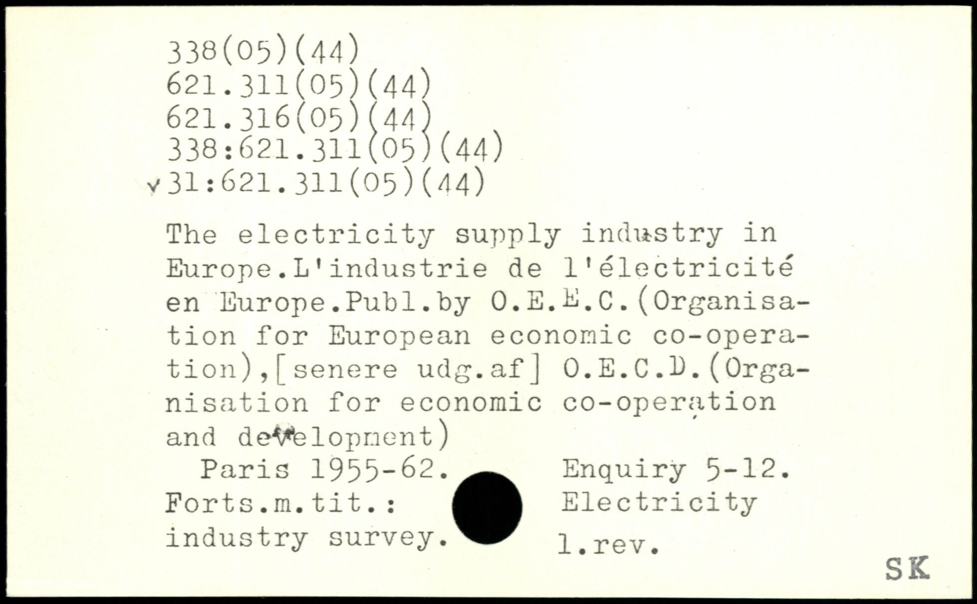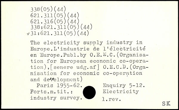 The electricity supply industry in Europe.L1 industrie de l'électricité en Europe.Puhl.by O.E.E.C.(Organisation for European economic co-operation) ,[ senere udg.af] 0.E.C.P.(Organisation for economic co-operation and development)
