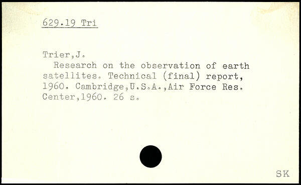 Research on the observation of earth satellites, Technical (final) report, 1960. Cambridge,U.SoA.,Air Force Res. Center,1960.