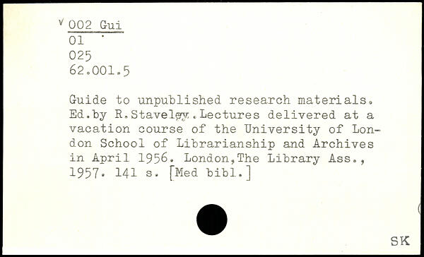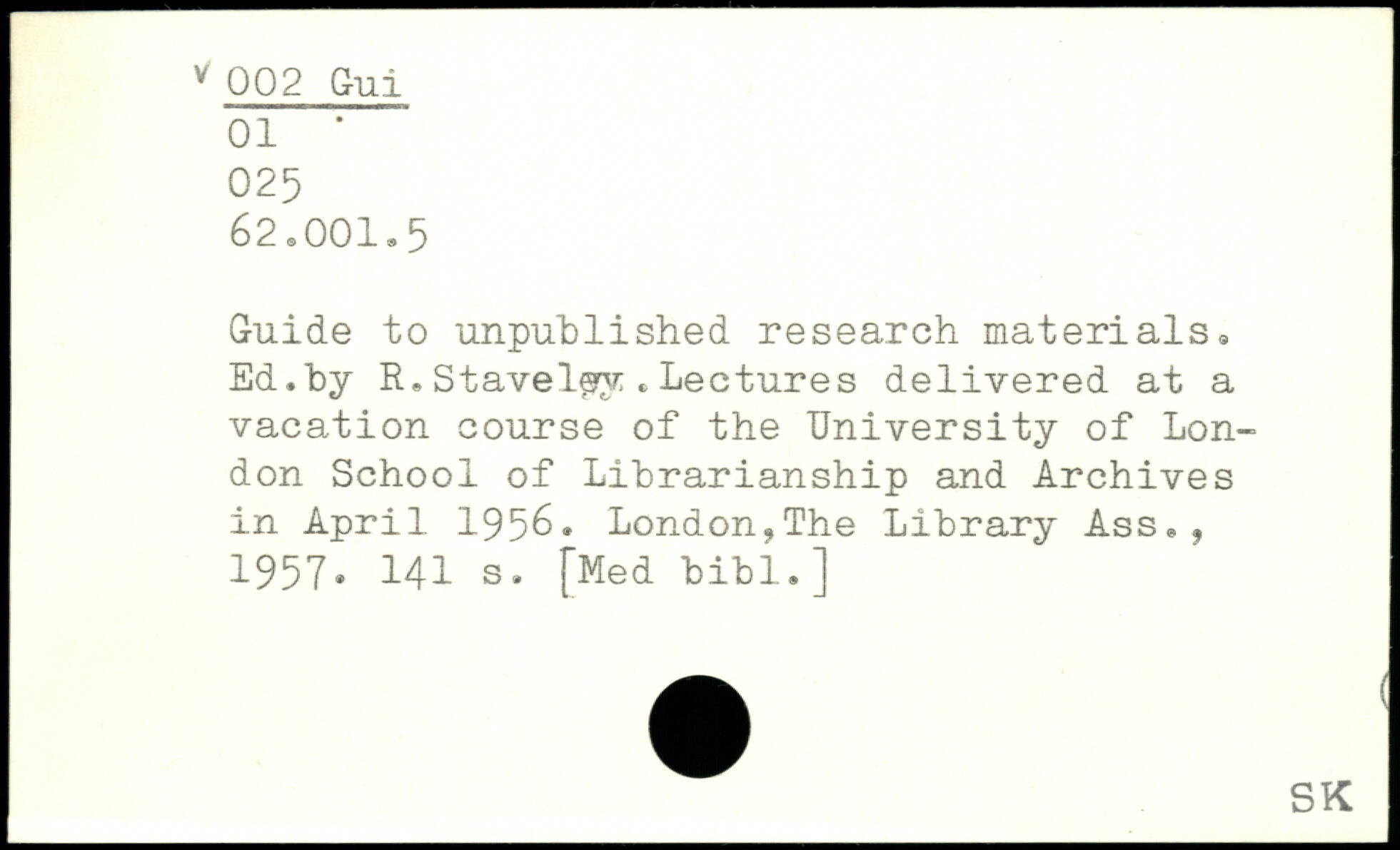 Guide to unpublished research materials. Ed.by R.Staveley .Lectures delivered at a vacation course of the University of London School of Librarianship and Archives in April 1956.