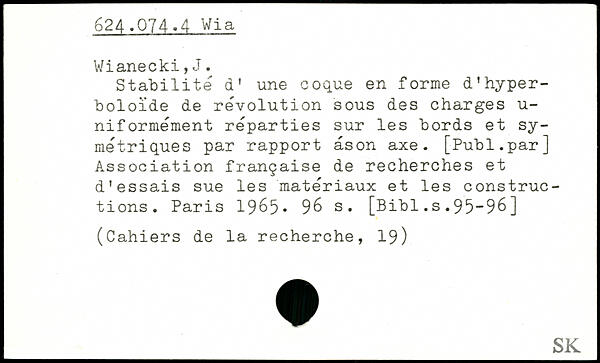 Stabilité d' une coque en forme d'hyper-boloïde de re'volution sous des charges u-niformement reparties sur les bords et symétriques par rapport ason axe. [Publ.par] Association française de recherches et d'essais sue les matériaux et les constructions.