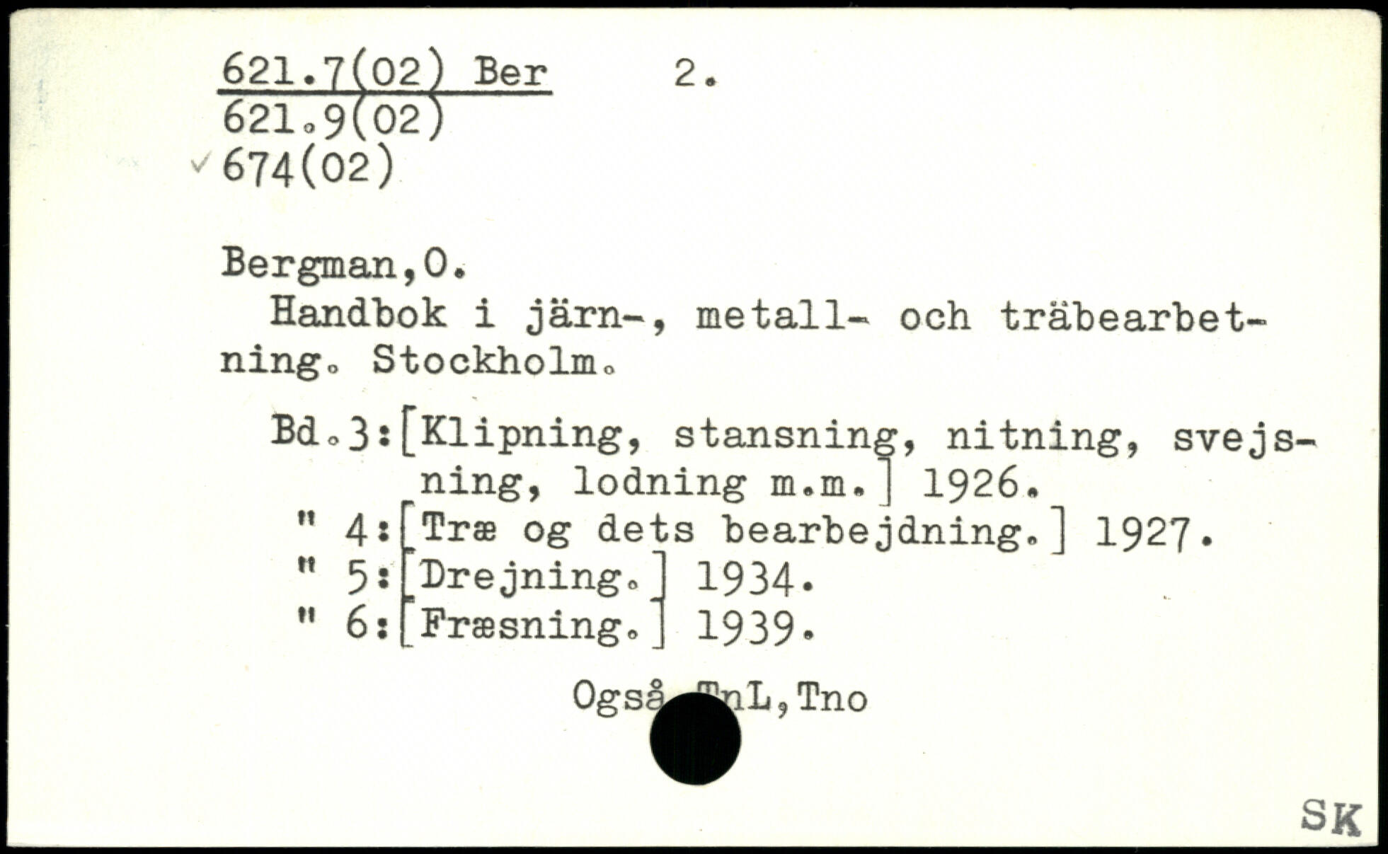Handbok i järn-, metall- och träbearbetning,, Stockholm,, Bd o 3:[Klipning, stansning, nitning, svejsning, lodning m.m,] 1926. ” 4.,Træ og dets bearbejdning.] 1927. " 5s .Drejning.1 1934. " 6:[Fræsning.J 1939, 0gs^^^L,Tno