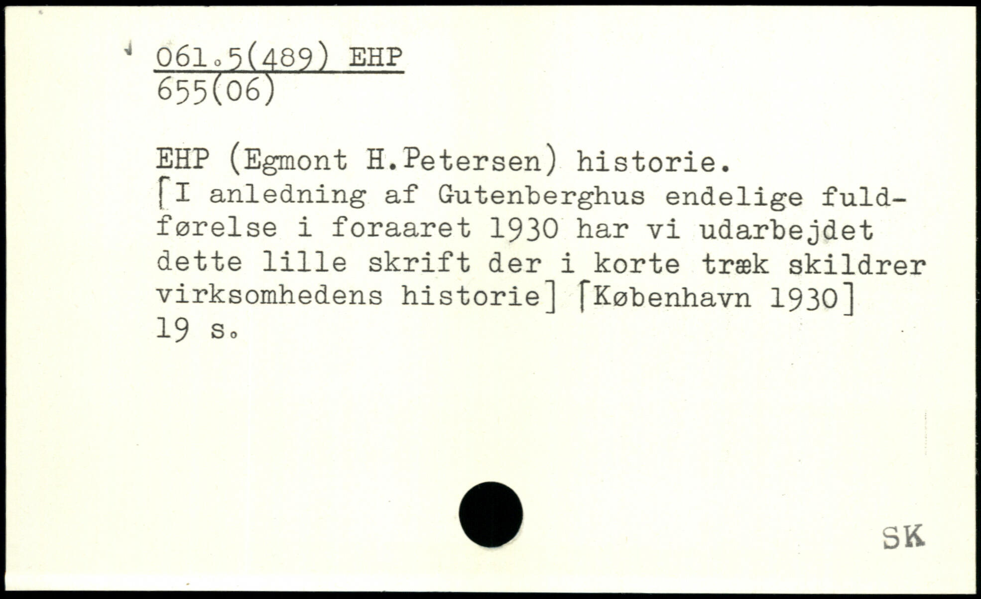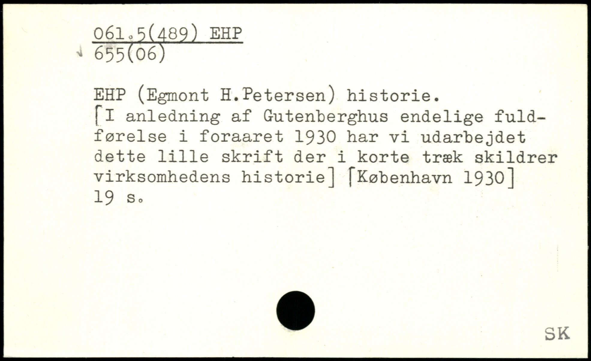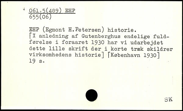 EHP (Egmont H.Petersen) historie. [I anledning af Gutenberghus endelige fuldførelse i foraaret 1930 har vi udarbejdet dette 1111e skrift der i korte træk skildrer virksomhedens historie]