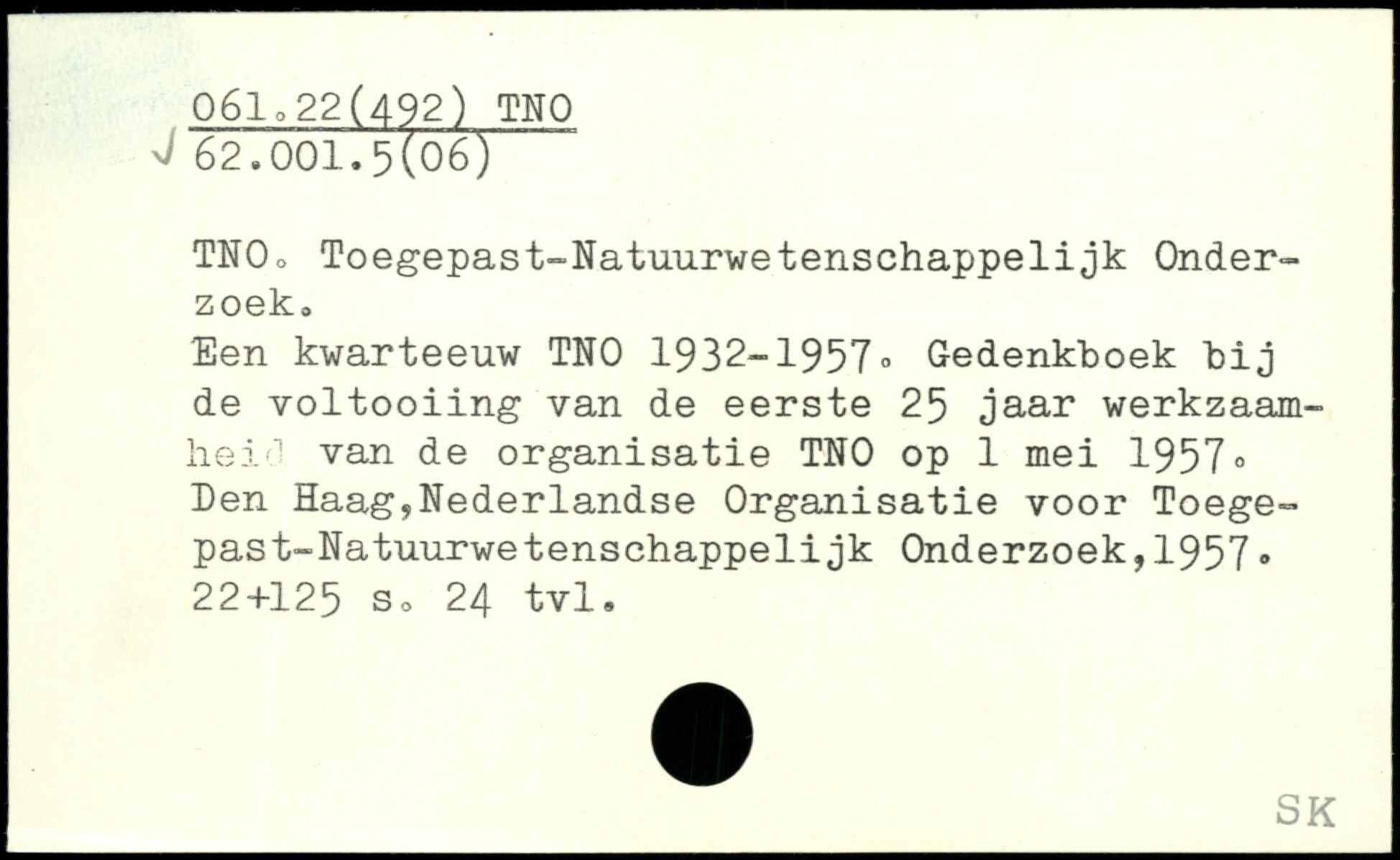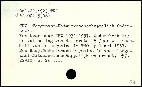 TNO0 Toegepast-Natuurwetenschappelijk Onder- zoeko Een kwarteeuw TNO 1932-1957, Gedenkboek bij de voltooiing van de eerste 25 jaar werkzaam-hei'l van de organisatie TNO op 1 mei 1957, Den Haag,Nederlandse Organisatie voor Toege-past-Natuurwetenschappelijk Onderzoek,1957
