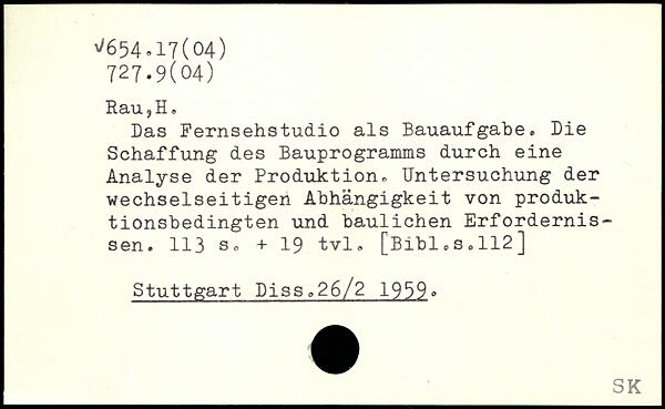 Das Fernsehstudio als Bauaufgabe. Die Schaffung des Bauprogramms durch eine Analyse der Produktion. Untersuchung der wechselseitigen Abhängigkeit von produktionsbedingten und baulichen Erfordernissen.