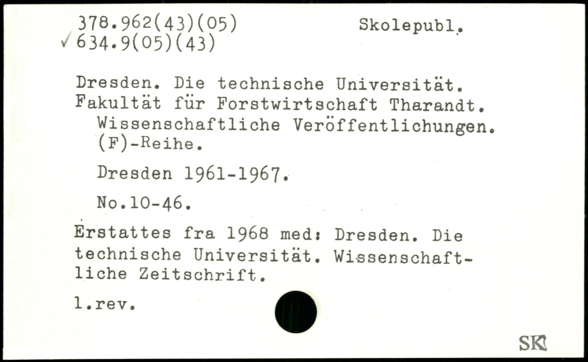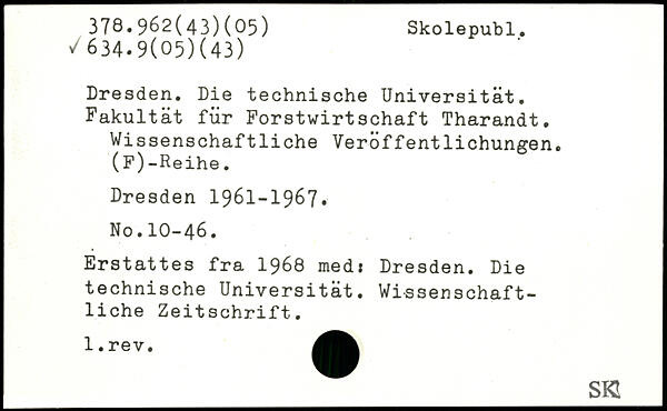Dresden. Die technische Universität. Fakultät für Forstwirtschaft Tharandt. Wissenschaftliche Veröffentlichungen. (F)-Reihe. Dresden 1961-1967. No.lO-46. Erstattes fra 1968 medt Dresden. Die technische Universität. Wissenschaftliche Zeitschrift. _SKI
