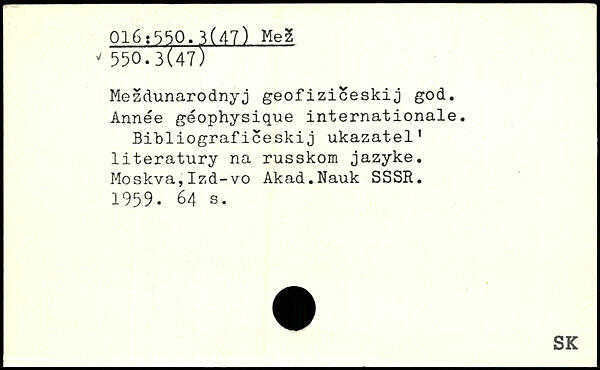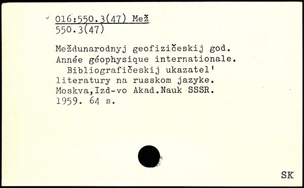 Mezdunarodnyj geofiziceskij god. Année géophysique internationale. Bibliograficeskij ukazatel1 literatury na russkom jazyke. Moskva,Izd-vo Akad.Nauk SSSR. 1959.