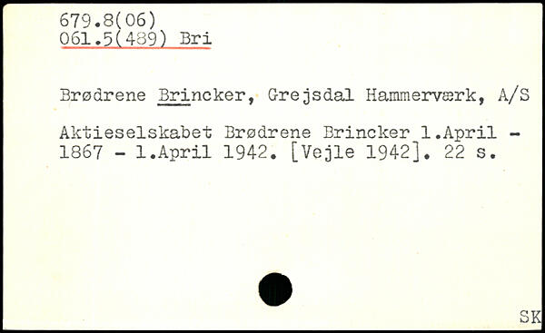 Brødrene Brincker. Orejsdal Hammerværk, A/S Aktieselskabet Brødrene Brincker 1.April -1867 - 1.April 1942. [Vejle 1942].
