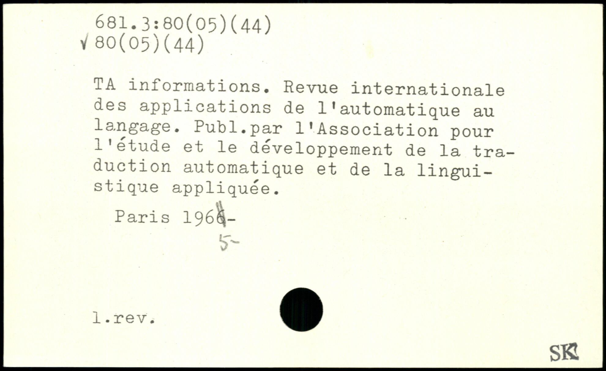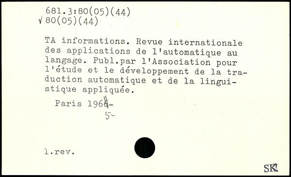 TA informations. Revue internationale des applications de l'automatique au langage. Publ.par l'Association pour l'étude et le développement de la traduction automatique et de la linguistique appliquée. Paris 196^- _S KL