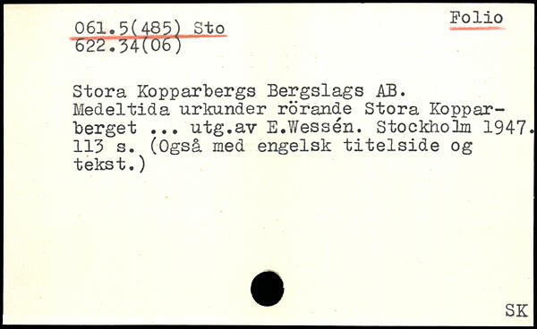 Stora Kopparbergs Bergslags AB. Medeltida urkunder rörande Stora Kopparberget ... utg.av E.Wessén.