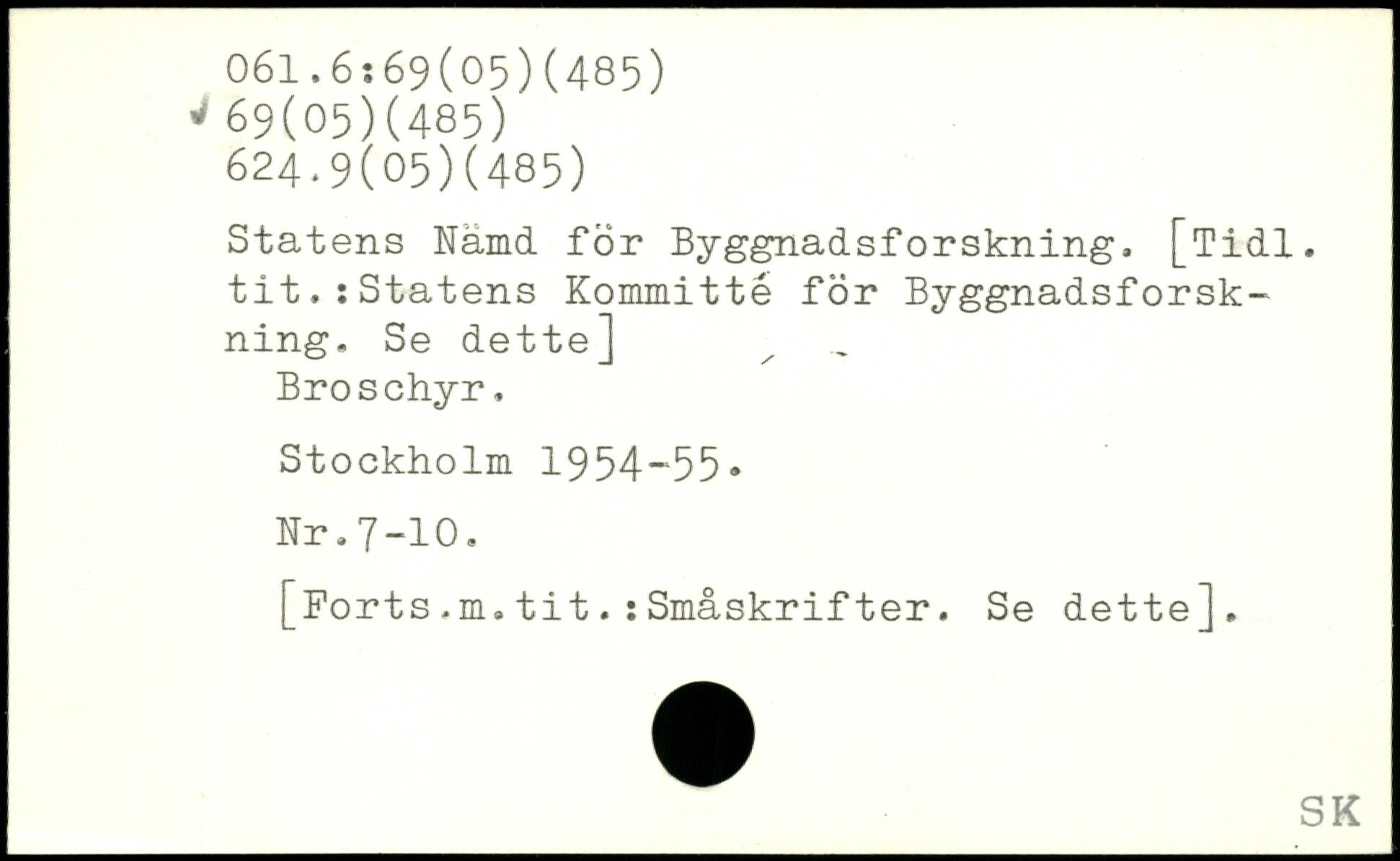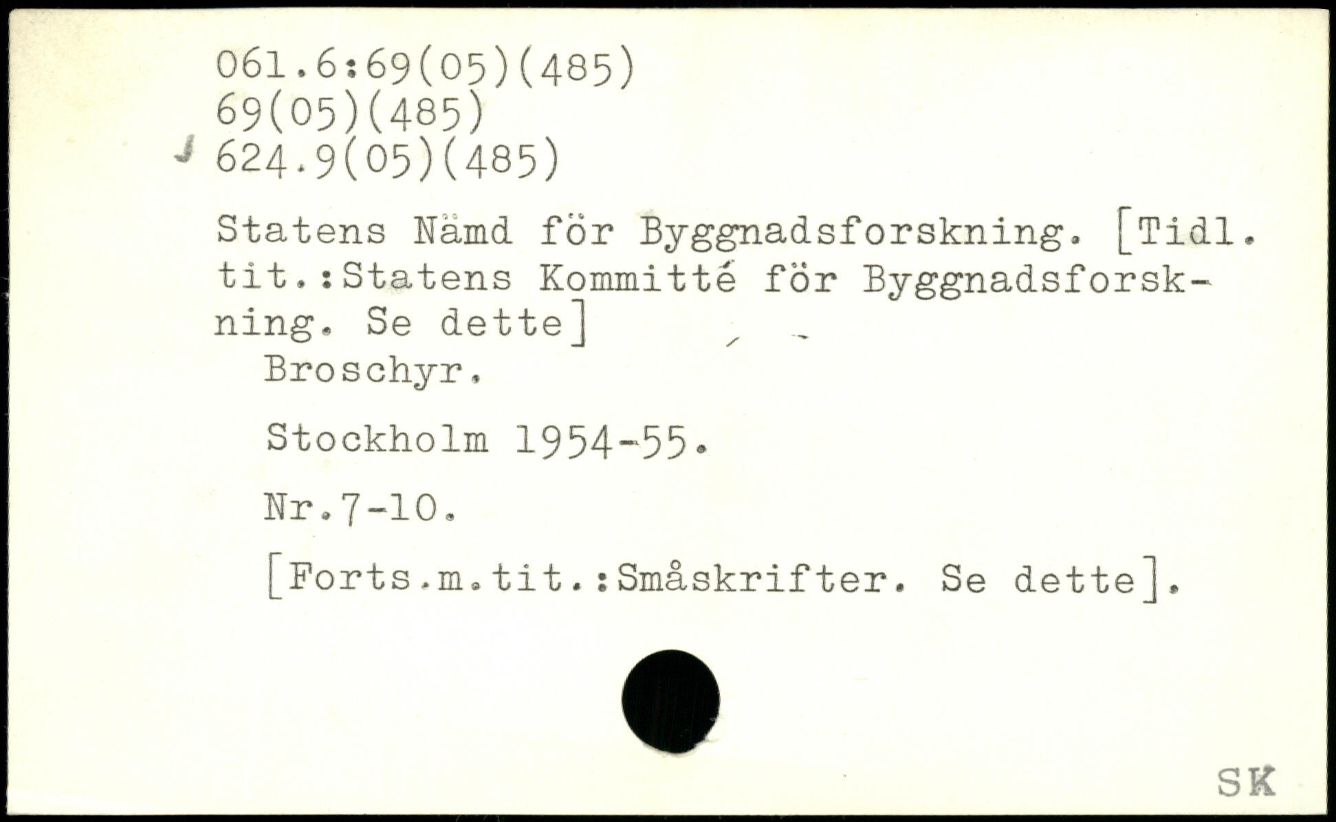 Statens Hämd för Byggnadsforskning. [Tidl. tit.:Statens Kommitté för Byggnadsforsk-ning. Se dette] Broschyr.