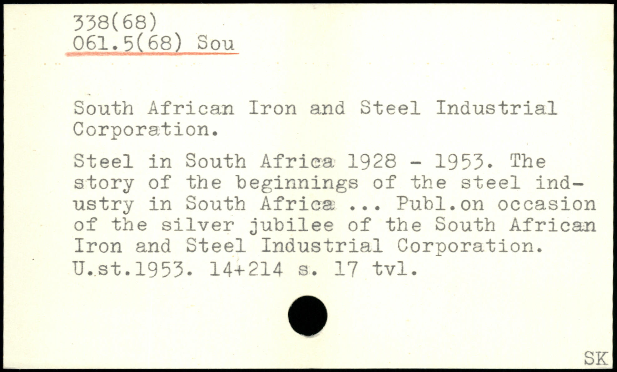 South African Iron and Steel Industrial Corporation. Steel in South Africa 1928 - 1953. The story of the beginnings of the steel industry in South Africa ... Publ.on occasion of the silver jubilee of the South African Iron and Steel Industrial Corporation. U.st.1953.