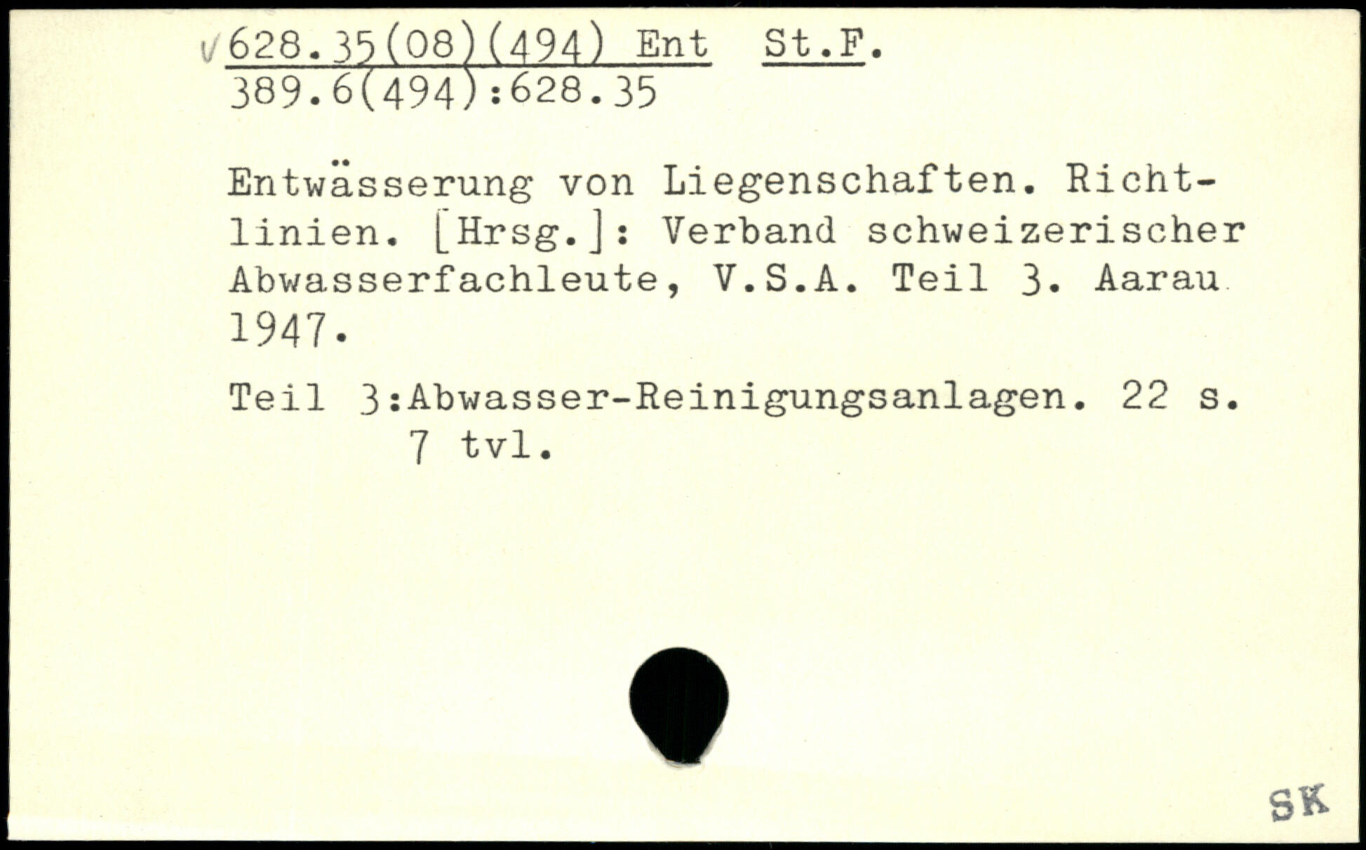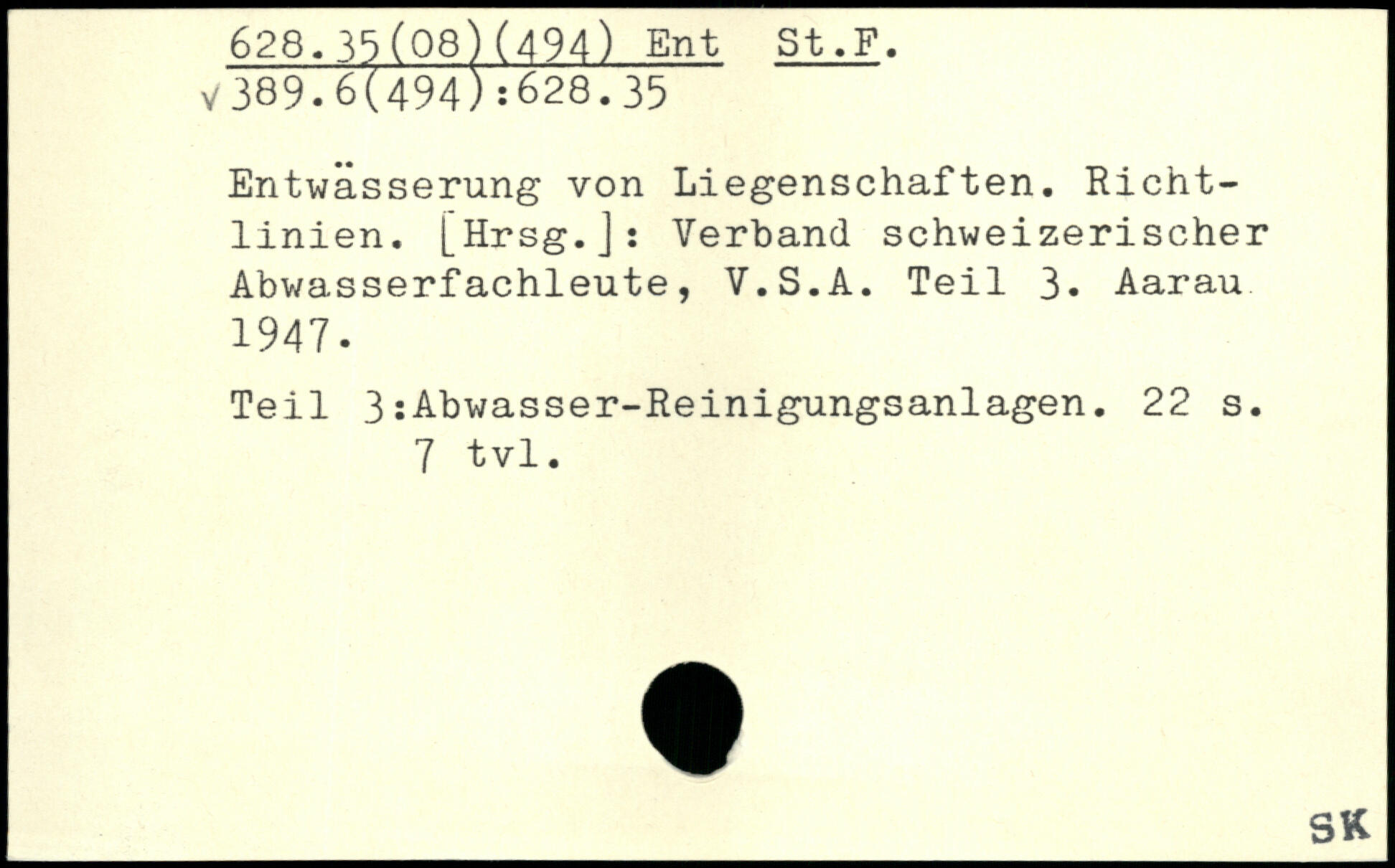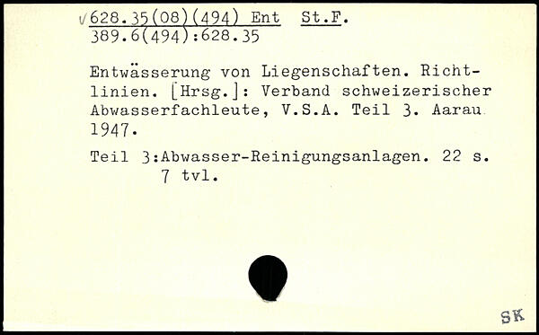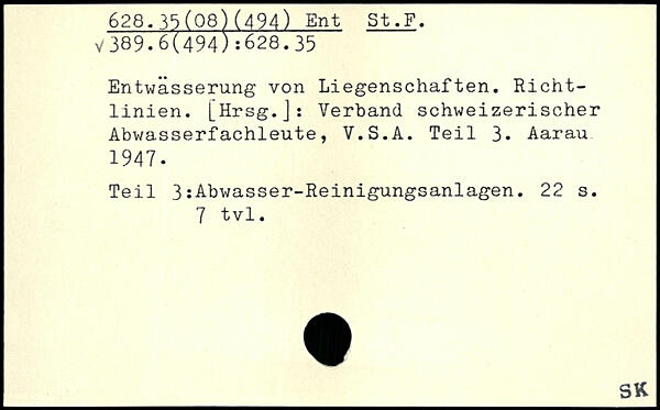 Entwässerung von Liegenschaften. Richtlinien. [Hrsg.]: Verband schweizerischer Abwasserfachleute, V.S.A. Teil 3. Aarau 1947. Teil 3:Abwasser-Reinigungsanlagen.