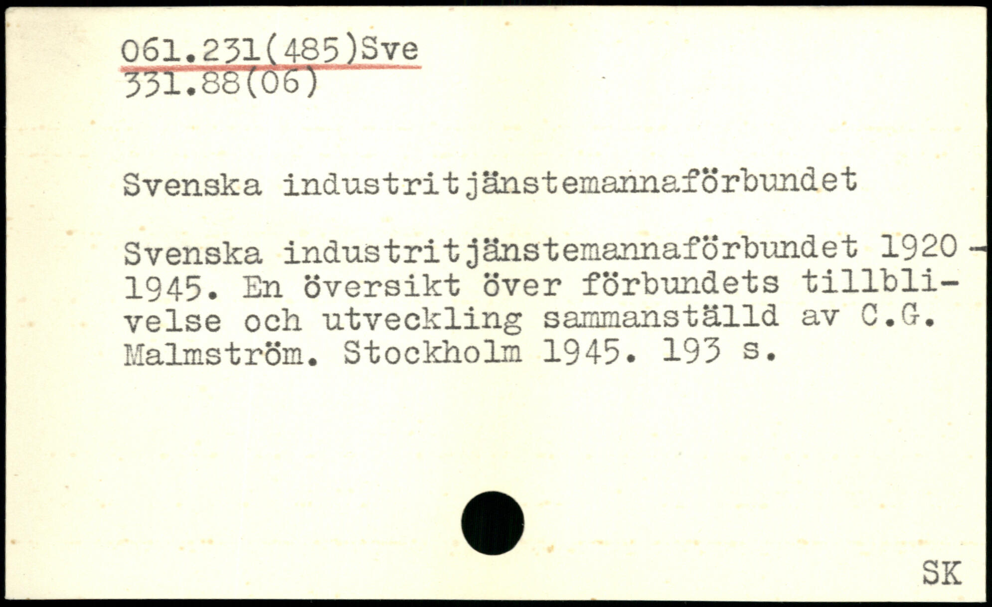 Svenska indus t rit jänstemannaf örbundet Svenska industri tjänstemannaförbund et 1920 -1945. En översikt över förbundets tillblivelse och utveckling sammanställd av 0.0. Malmström.