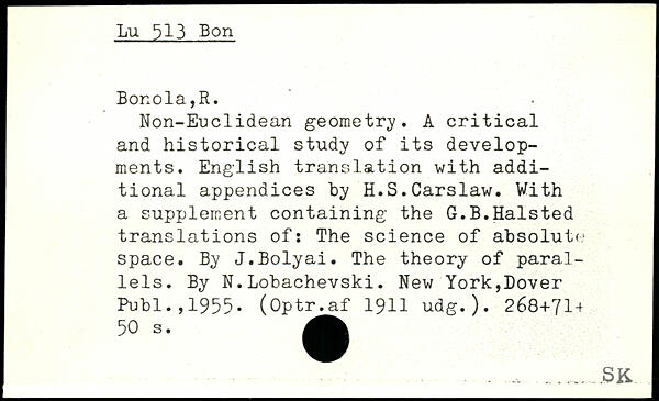 Non-Euclidean geometry. A critical and historical study of its developments. English translation with additional appendices by H.S.Carslaw. With a supplement containing the G.B.Halsted translations of: The science of absolute space. By J.Bolyai. The theory of parallels. By N.Lobachevski.