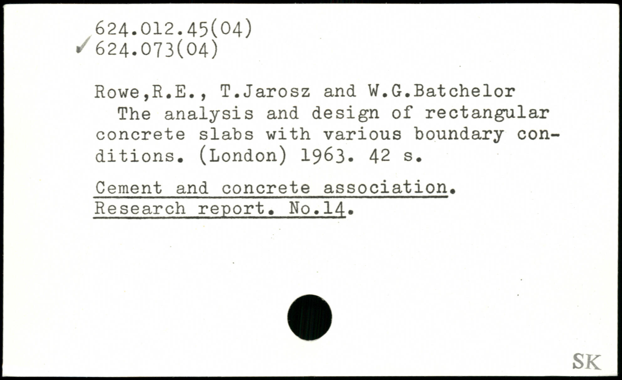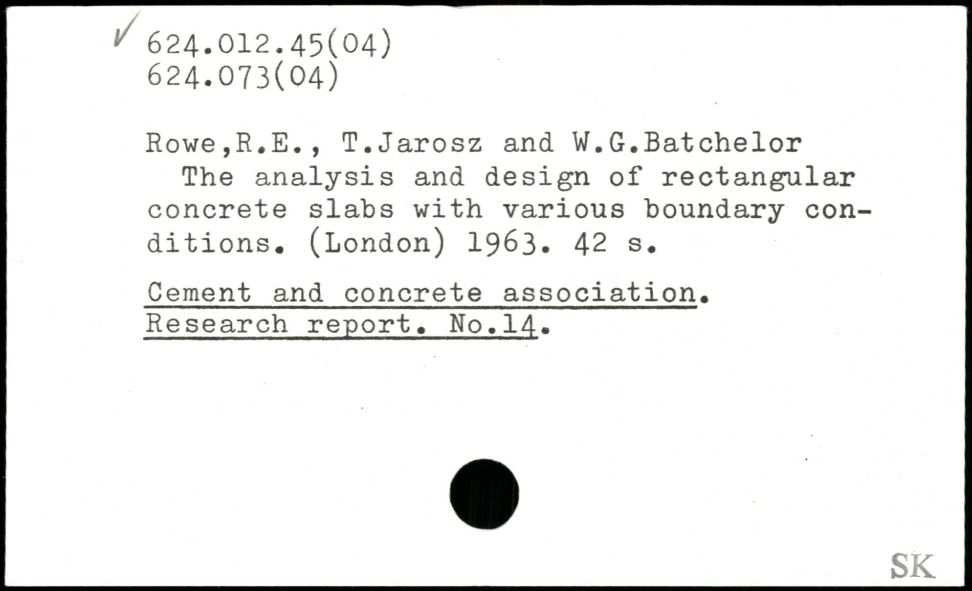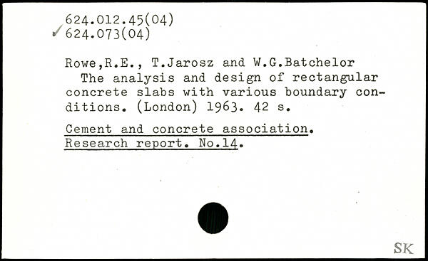 Rowe,R.E., T.Jarosz and W.G.Batchelor The analysis and design of rectangular concrete slabs with various boundary conditions. (London) 1963.