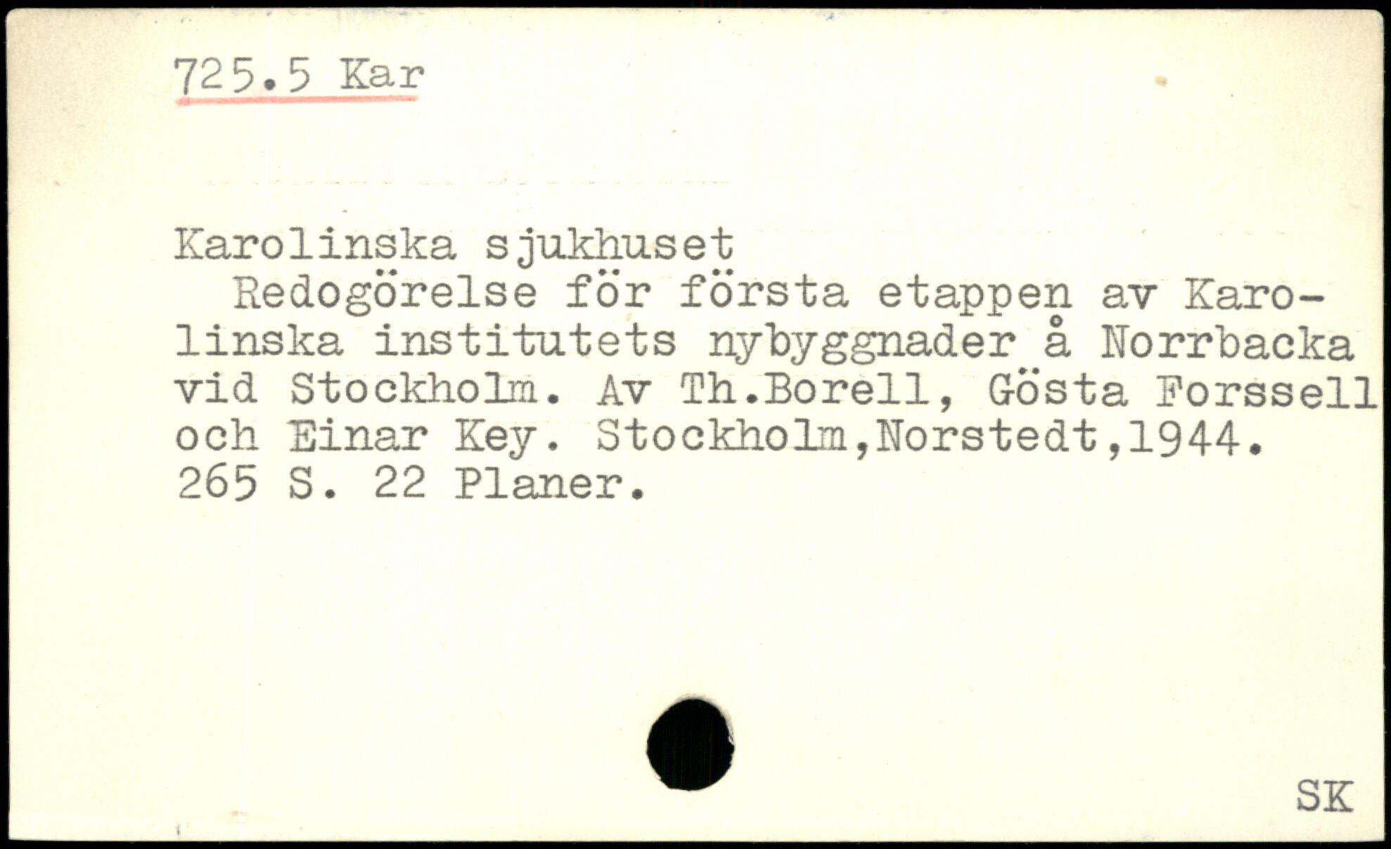 Karolinska sjukhuset Redogörelse för första etappen av Karolinska institutets nybyggnader å Norrbacka vid Stockholm. Av Th.Borell, Gösta Forssell och Einar Key.