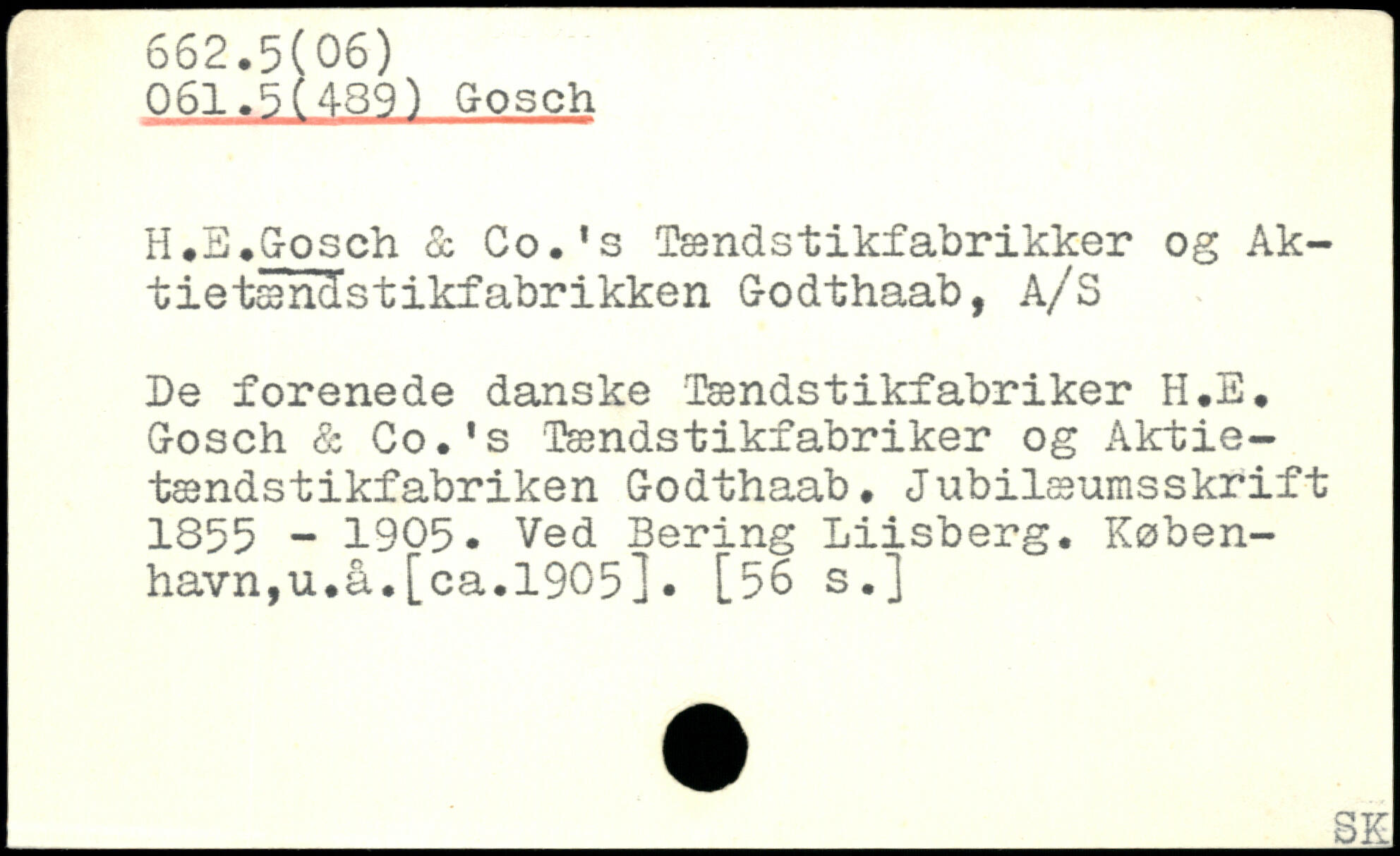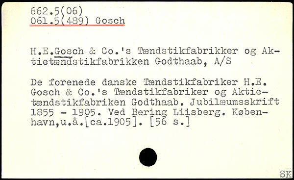 H.B.Gosch & Co.’s Tændstikfabrikker og Ak-tietæn&stikfabrikken Godthaab, A/S De forenede danske Tændstikfabriker H.E. Gosch & Co.'s Tændstikfabriker og Aktie-tændstikfabriken Godthaab. Jubilæumsskrift 1855 - 1905. Ved Bering Lüsberg. København, u.å.[ca.1905]. [