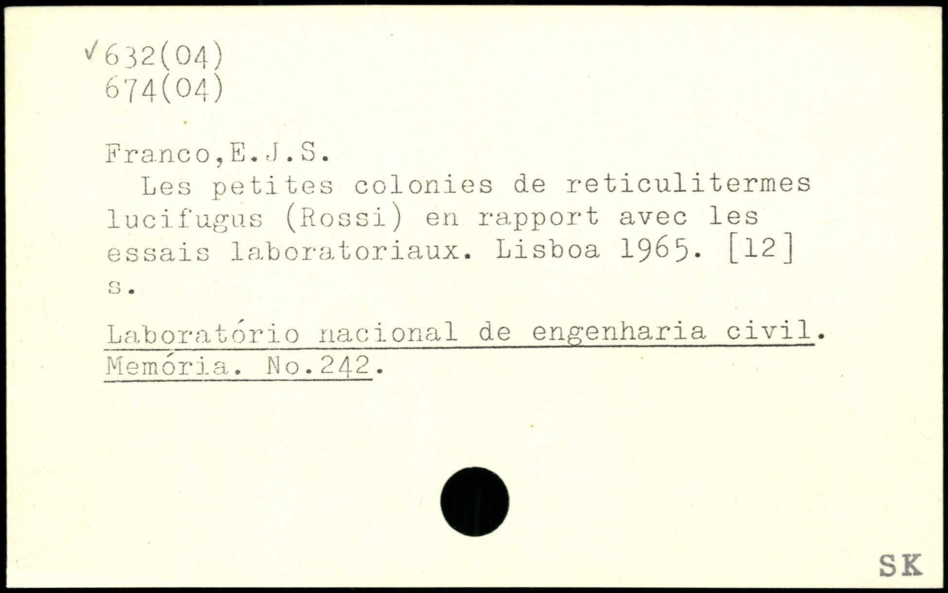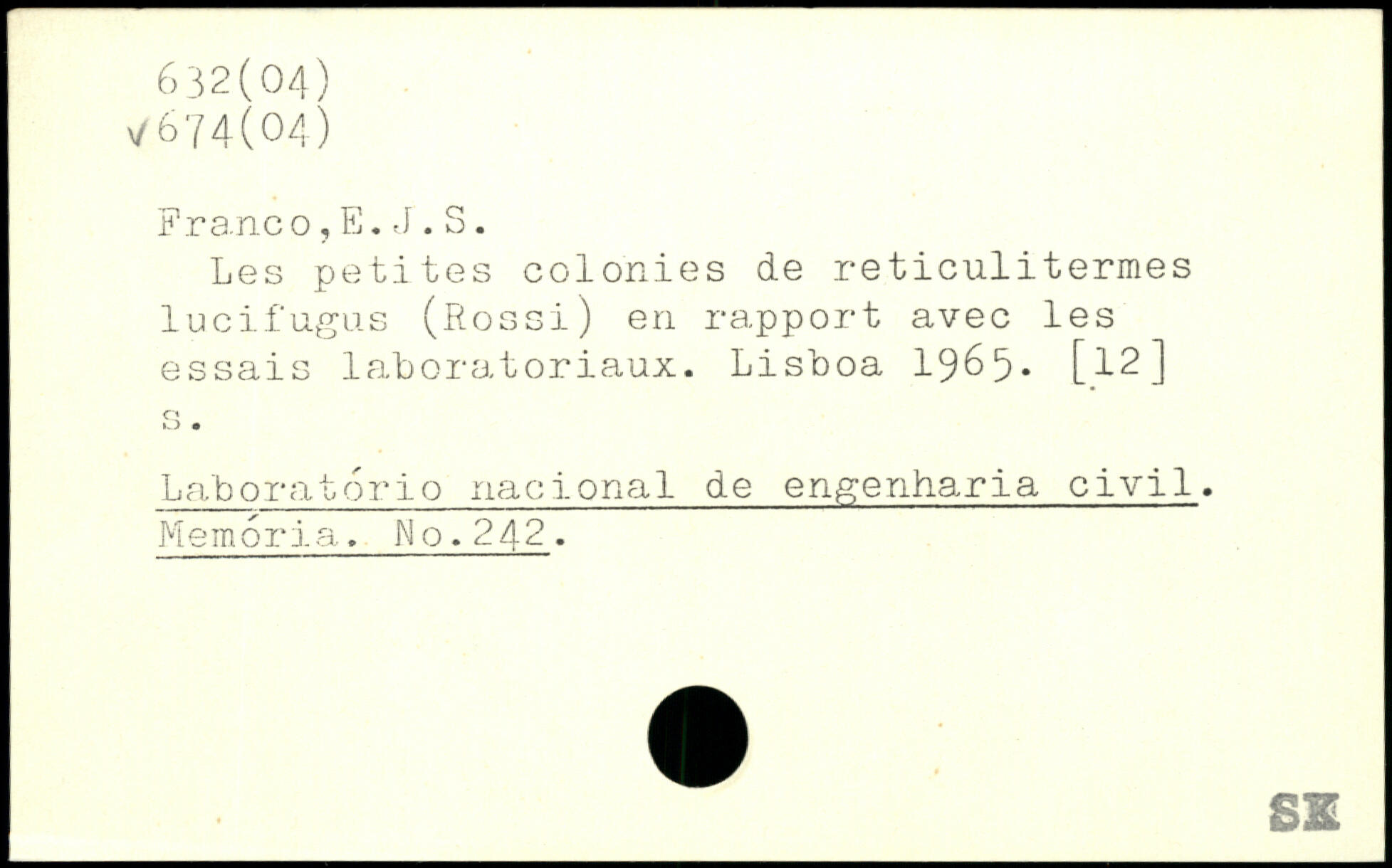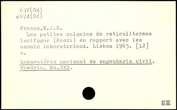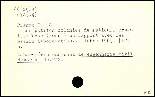 Les petites colonies de reticulitermes lucifugus (Rossi) en rapport avec les essais laboratoriaux. Lisboa 1965- [12] Laboratorio nacional de engenharia civil. Memoria. Mo.242.