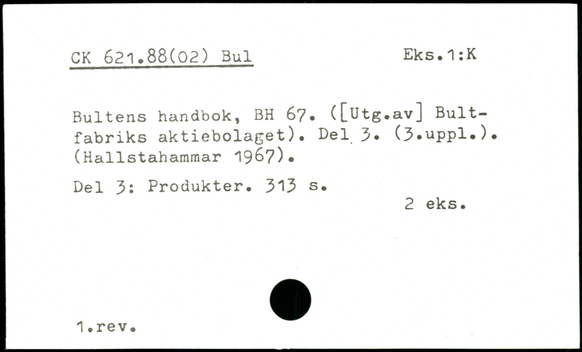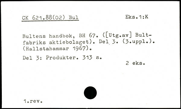 Bultens handbok, BH 67. ([utg.av] Bult-fabriks aktiebolaget). Del 3, (3,uppl.). (Hallstahammar 1967). Del 3: Produkter.