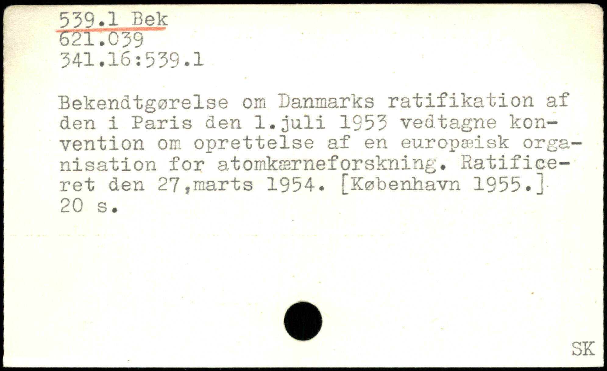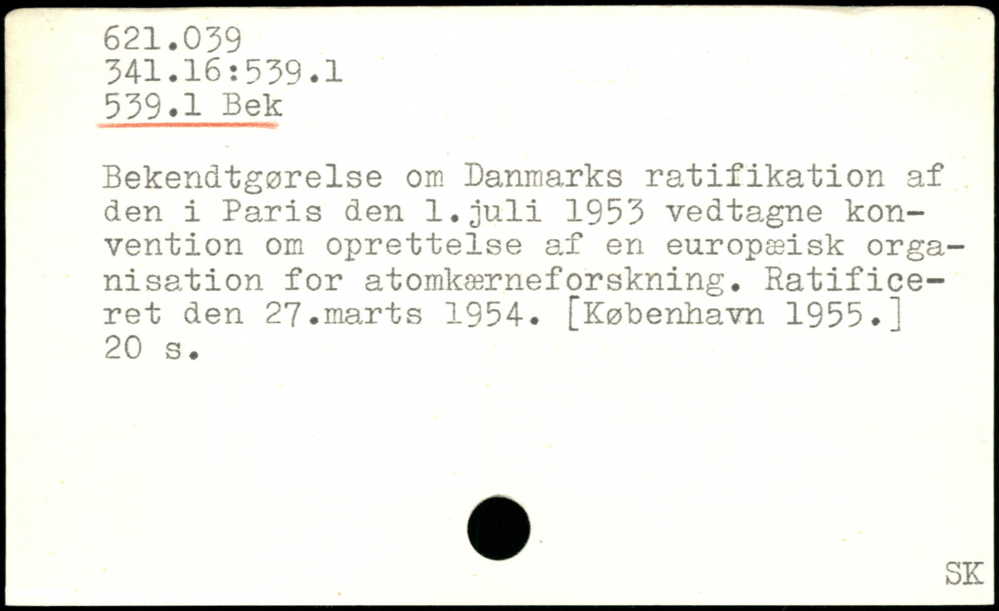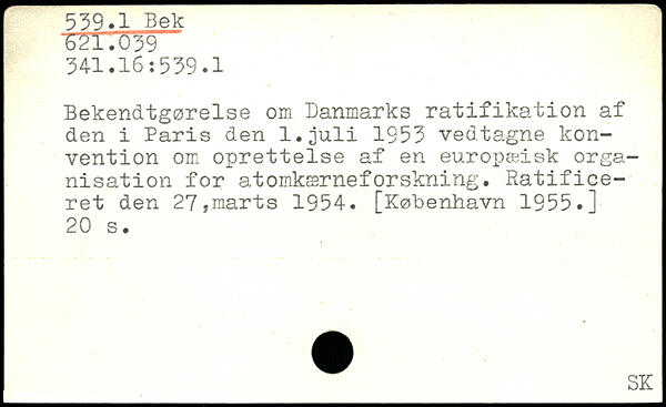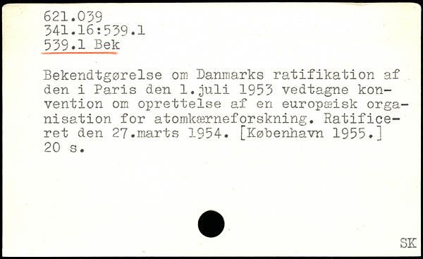 Bekendtgørelse om Danmarks ratifikation af den i Paris den l.juli 1955 vedtagne konvention om oprettelse af en europæisk organisation for atomkærneforskning. Ratificeret den 27,marts 1954.