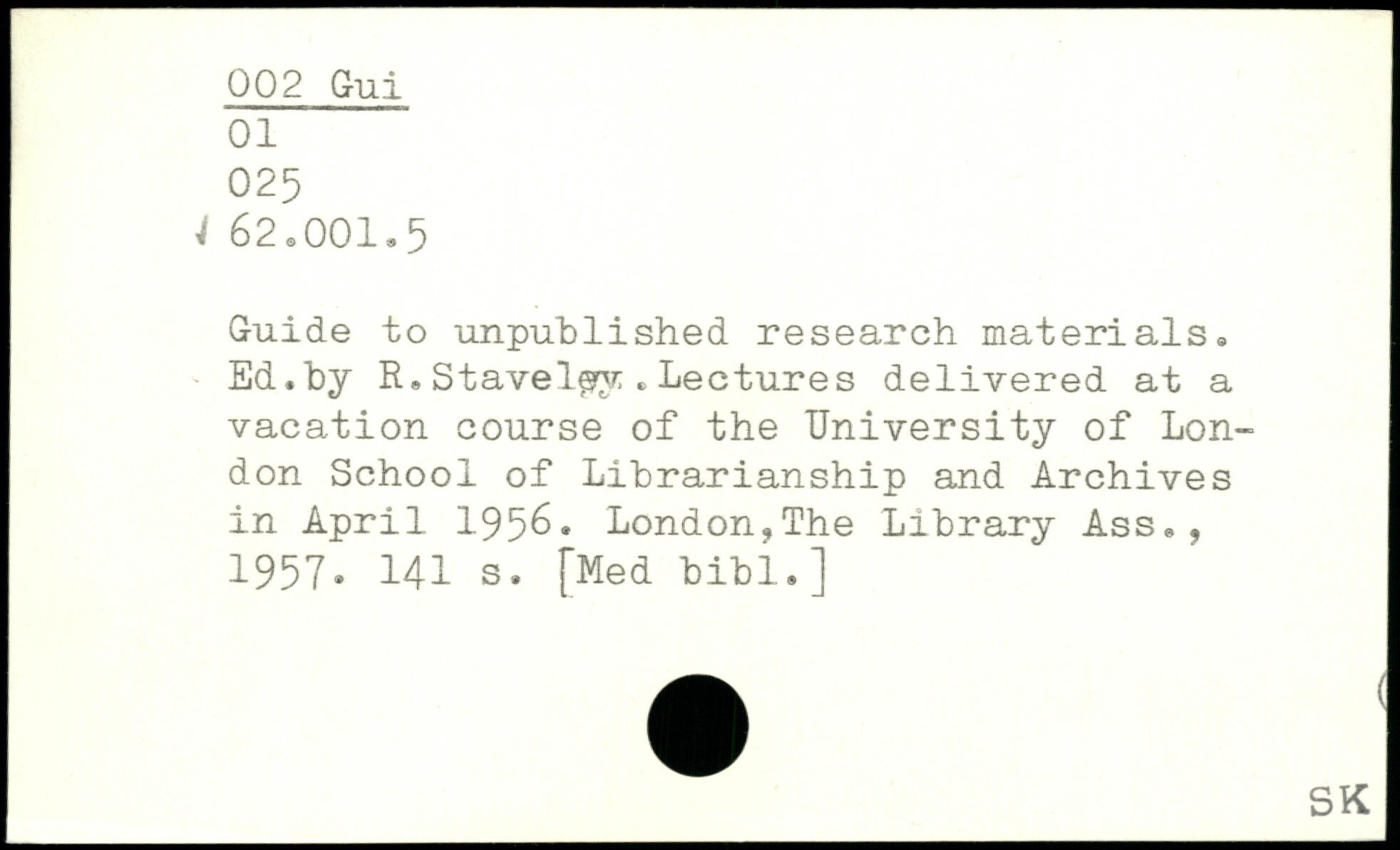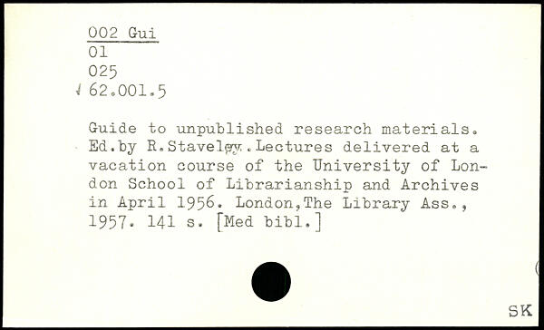 Guide to unpublished research materials. Ed.by R.Stavelgy ,Lectures delivered at a vacation course of the University of London School of Librarianship and Archives in April 1956.
