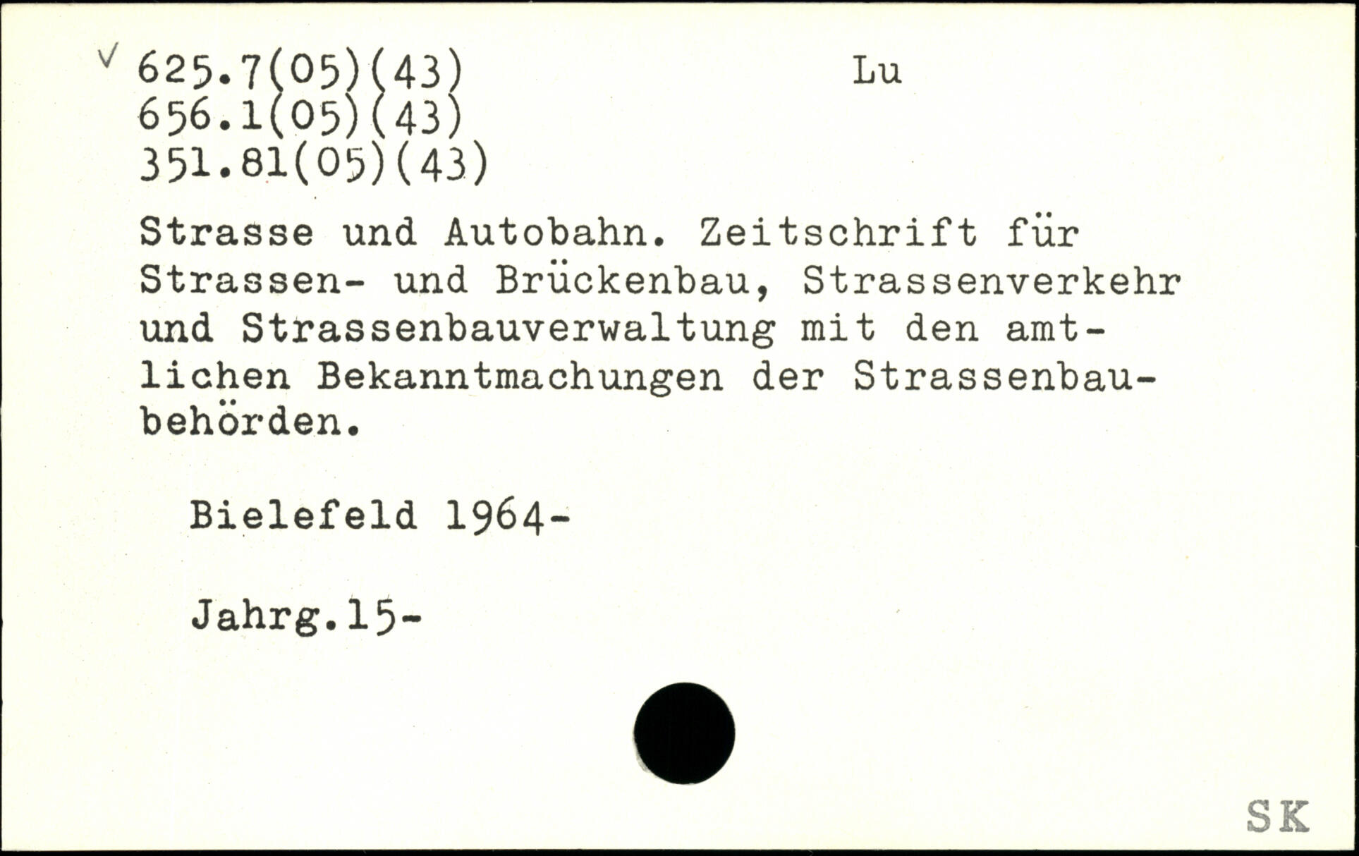 Strasse und Autobahn. Zeitschrift für Strassen- und Brückenbau, Strassenverkehr und Strassenbauverwaltung mit den amtlichen Bekanntmachungen der Strassenbau-behörden. Bielefeld 1964- Jahrg.15-