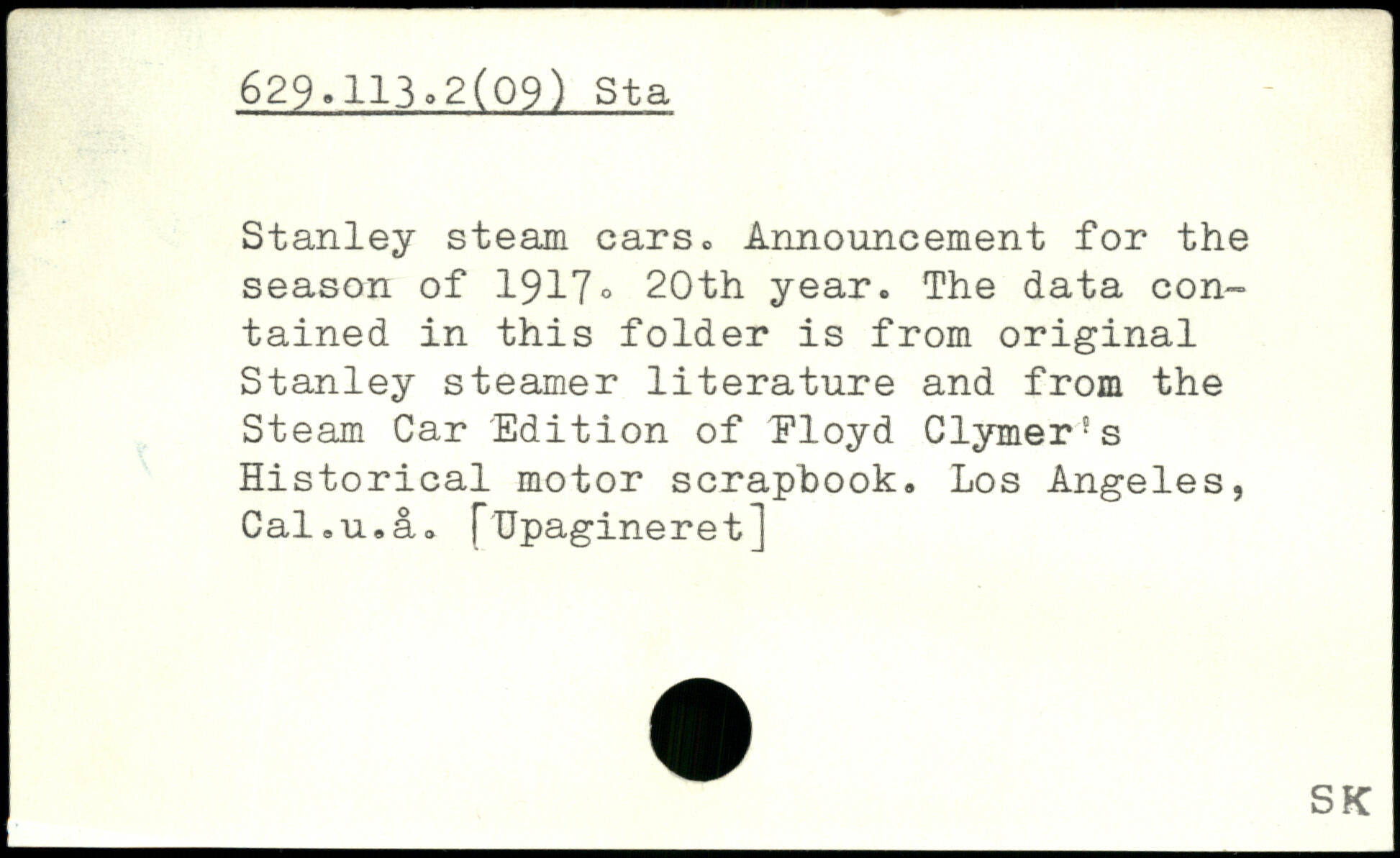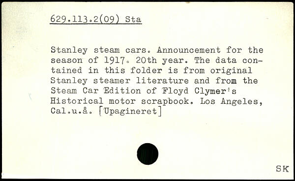 Stanley steam cars, Announcement for the season of 1917. 20th year. The data contained in this folder is from original Stanley steamer literature and from the Steam Car Edition of Eloyd Clymer's Historical motor scrapbook. Los Angeles, Cal.u.a. pUpagineret]