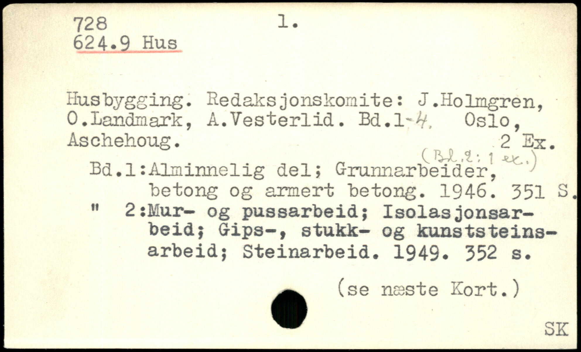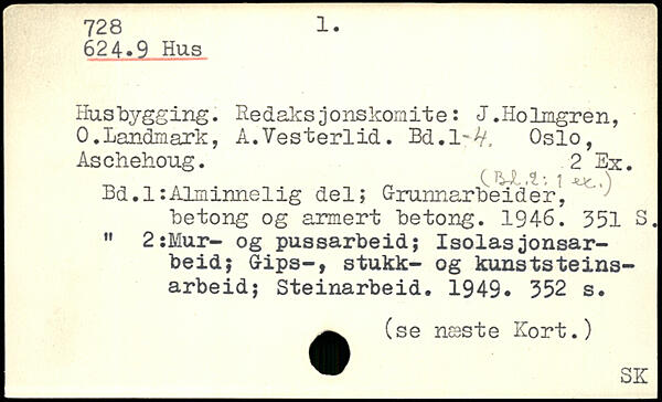 Husbygging. Redaksjonskomite: J.Holmgren, 0.Landmark, A.Vesterlid. Bd.l.^. Oslo, Aschehoug. 2 Ex. , CU.t', i Bd.l:Alminnelig del; Grunnarbeider, betong og armert betong. 1946.