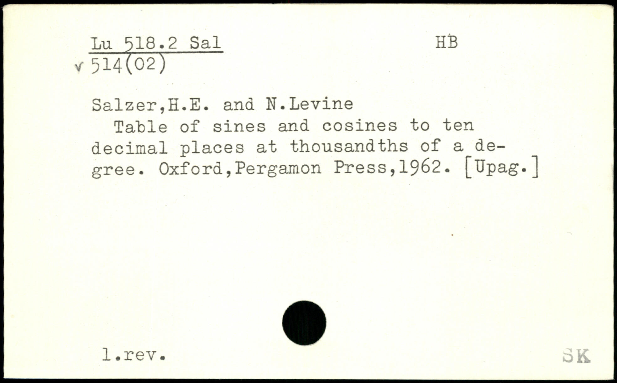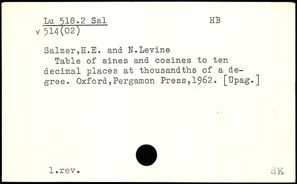 Table of sines and cosines to ten decimal places at thousandths of a degree.