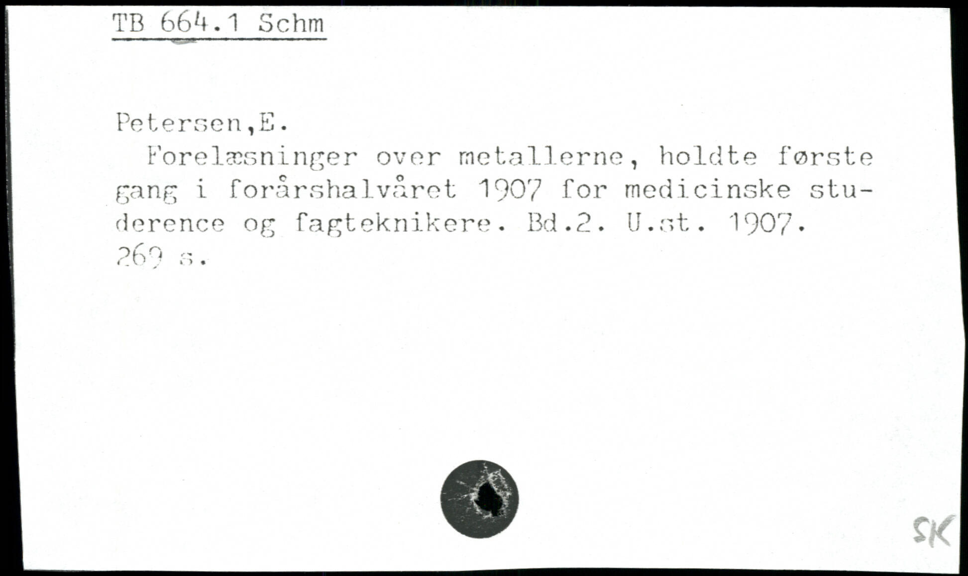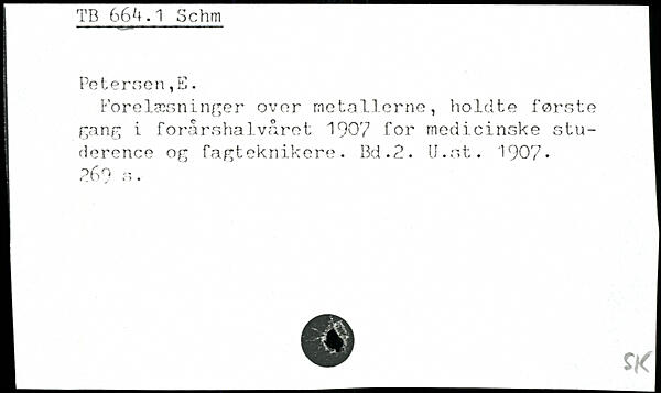 Petersen,E. S Forelæsninger over metallerne, holdte første l gang i forårshalvåret 1907 for medicinske studere nce og fagteknikere.