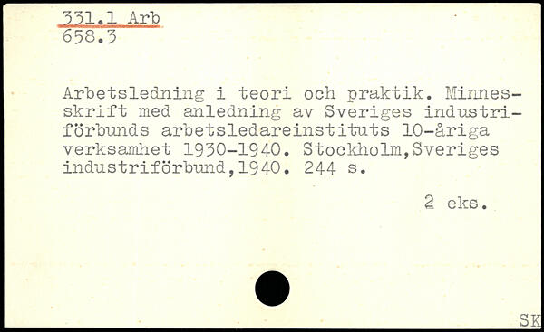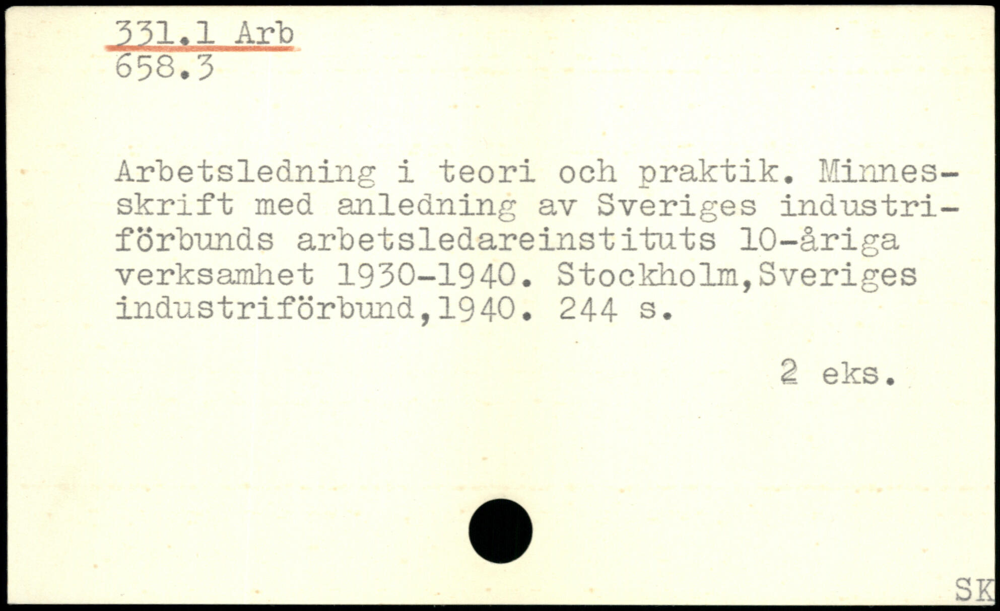 Arbetsledning i teori och praktik. Minnesskrift med anledning av Sveriges industriförbunds arbetsledareinstituts 10-åriga verksamhet 1930-1940.