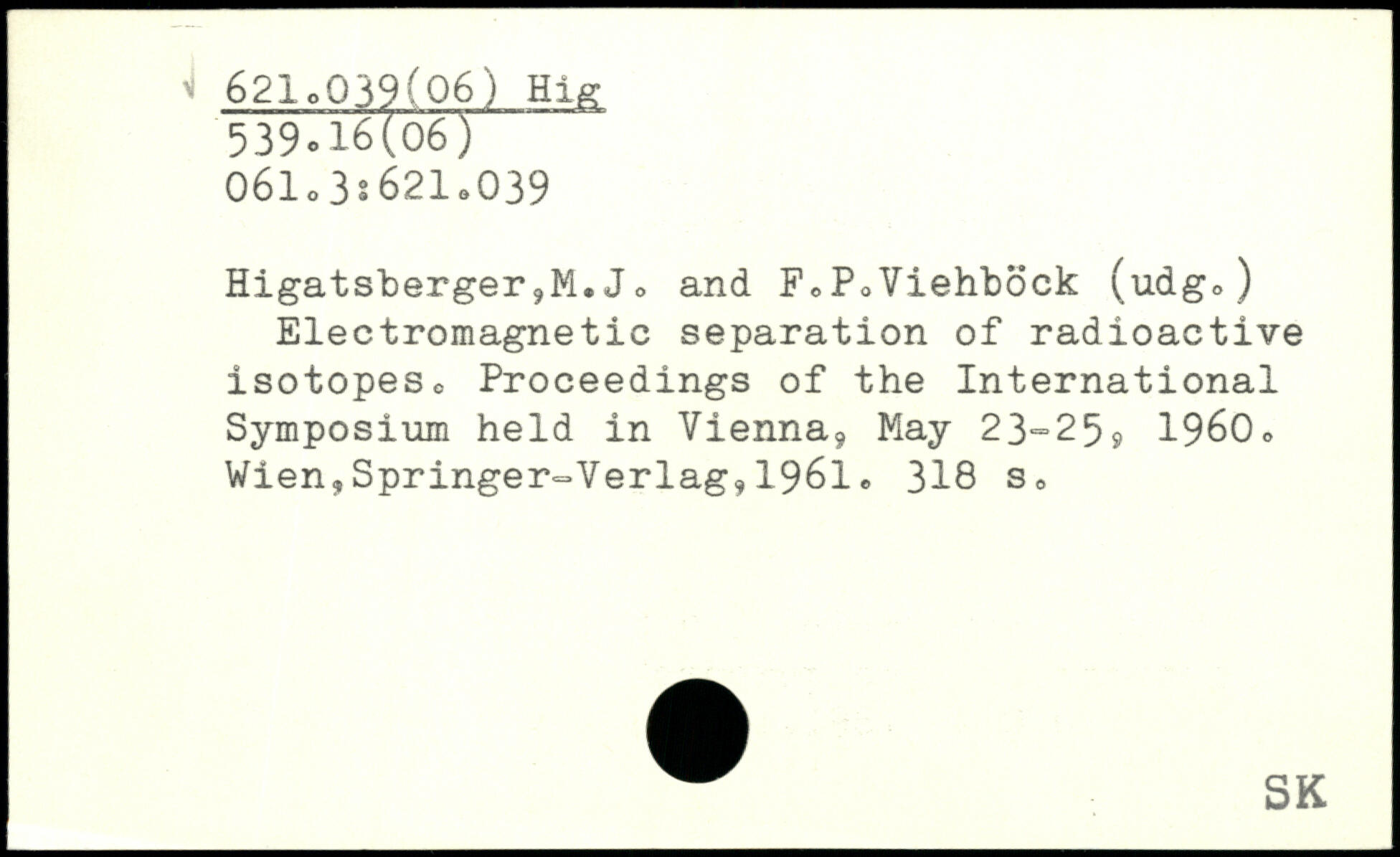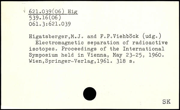 Higatsberger,M. J<> and F0P0Viehbock (udgo) Electromagnetic separation of radioactive isotopeso Proceedings of the International Symposium held in Vienna, May 23=25? 1960.
