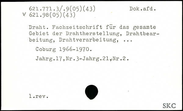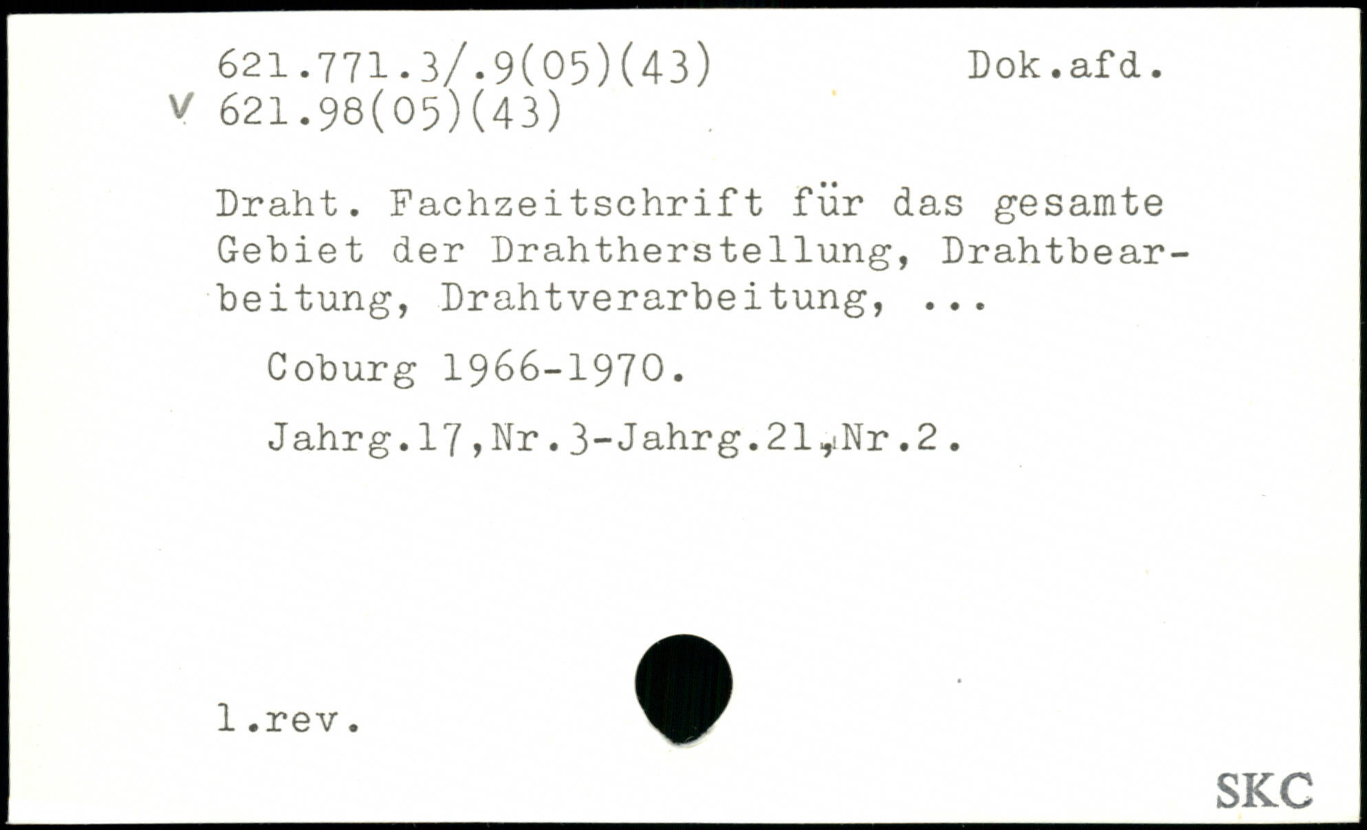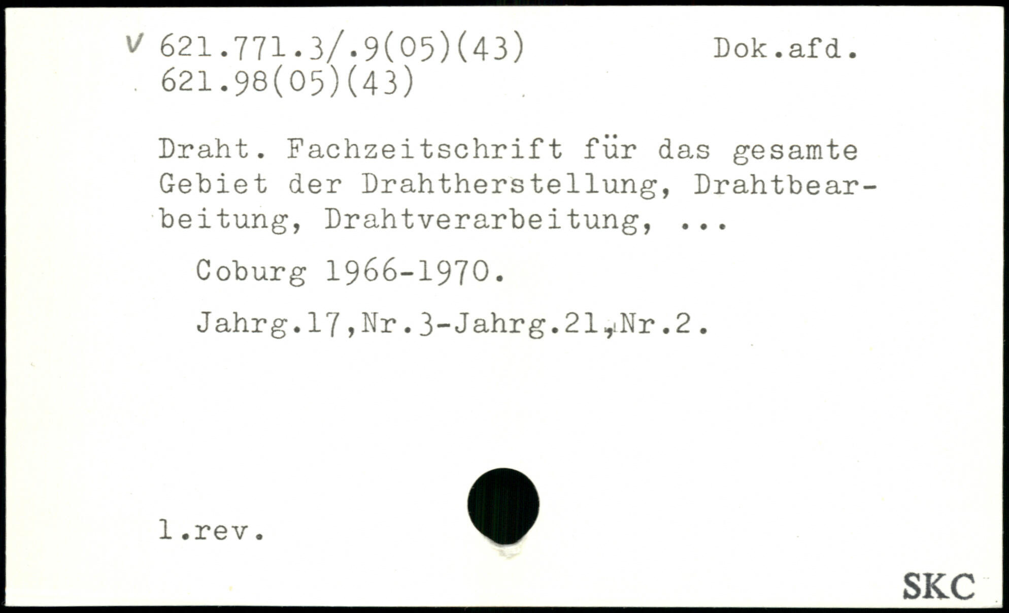 Draht. Fachzeitschrift für das gesamte Gebiet der Drahtherstellung, Drahtbearbeitung, Drahtverarbeitung, ... Coburg 1966-1970. Jahrg. 17 , Nr. 3-Jahrg.21,;Nr .2.