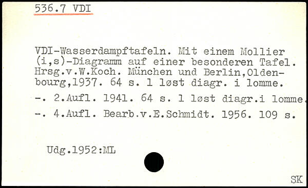VDI-Wasserdampftafeln. Mit einem Mollier (i,s)-Diagramm auf einer besonderen Tafel. Hrsg.y.W.Koch.