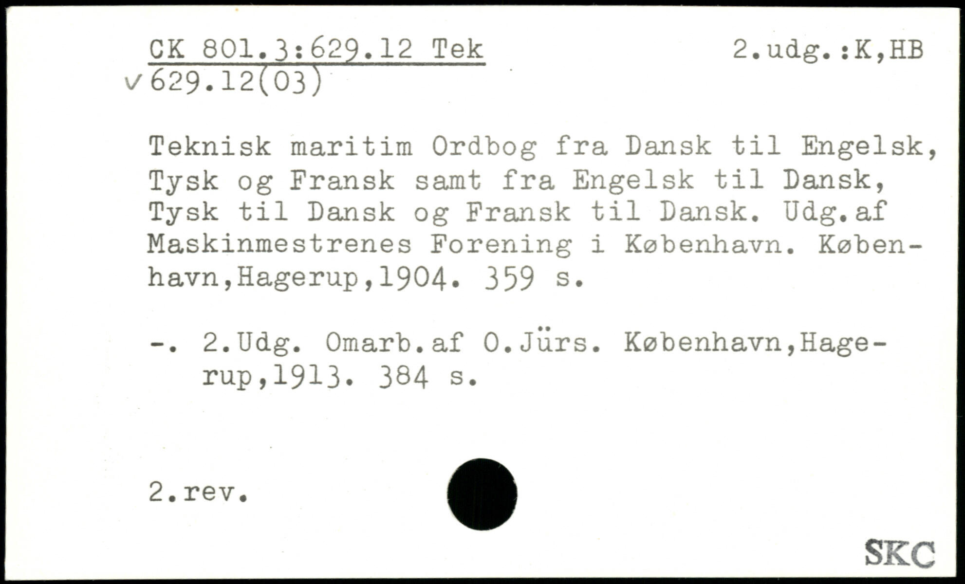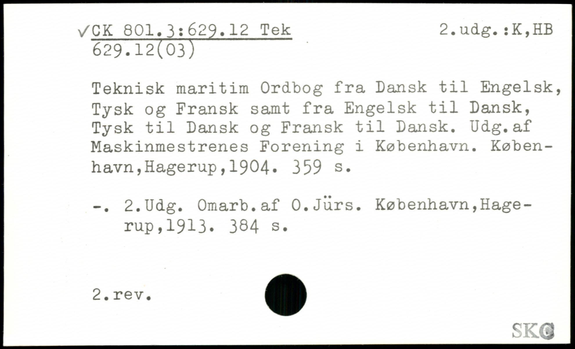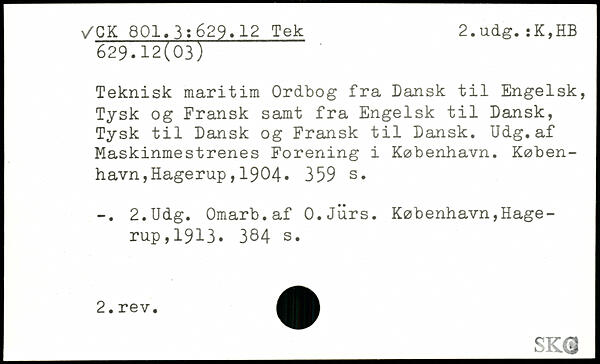 Teknisk maritim Ordbog fra Dansk til Engelsk, Tysk og Fransk samt fra Engelsk til Dansk, Tysk til Dansk og Fransk til Dansk. Udg.af Maskinmestrenes Forening i København.