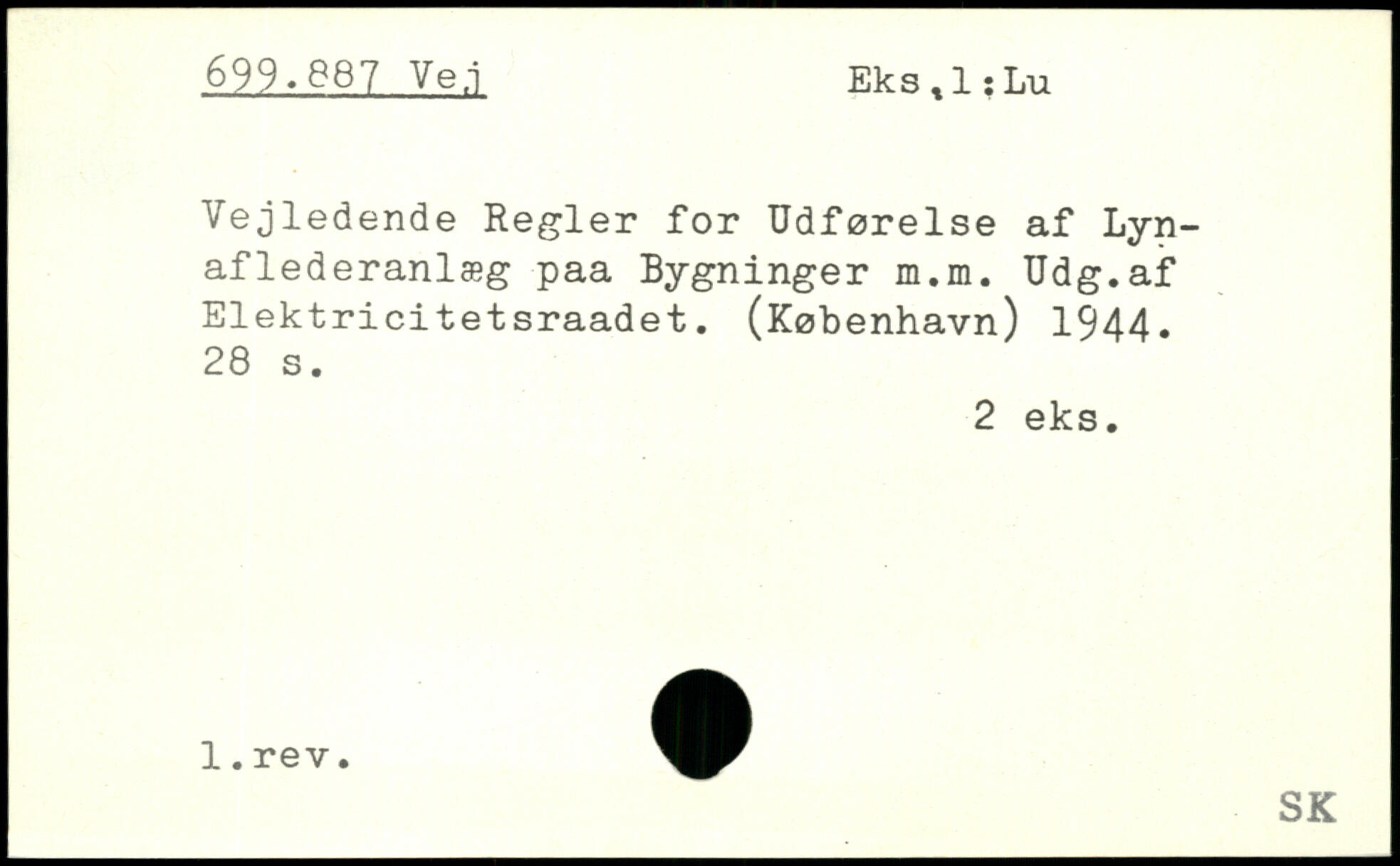 Vejledende Regler for Udførelse af Lynaflederanlæg paa Bygninger m.m. Udg.af Elektricitetsraadet. (København) 1944. 1
