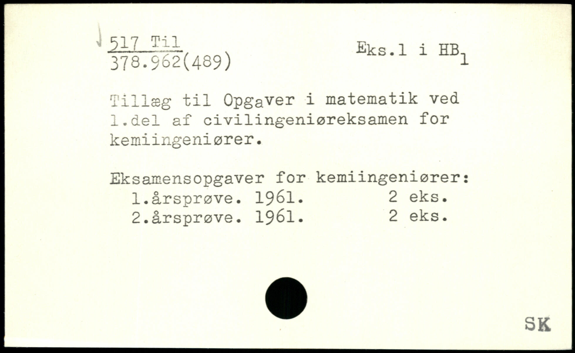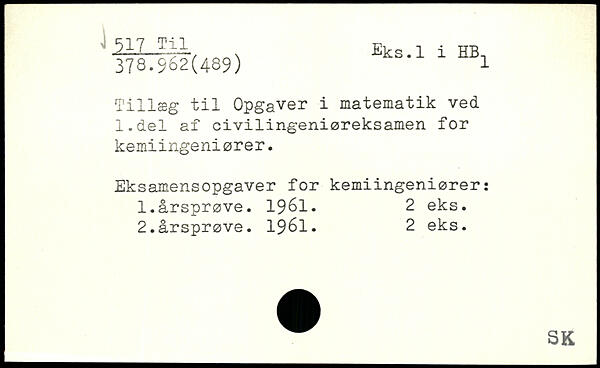 Tillæg til Opgaver i matematik ved. l.del af civilingeniøreksamen for kemiingeni ører. Eksamensopgaver for kemiingeniører: 1. årsprøve. 1961. 2 eks. 2. årsprøve. 1961. 2 eks.