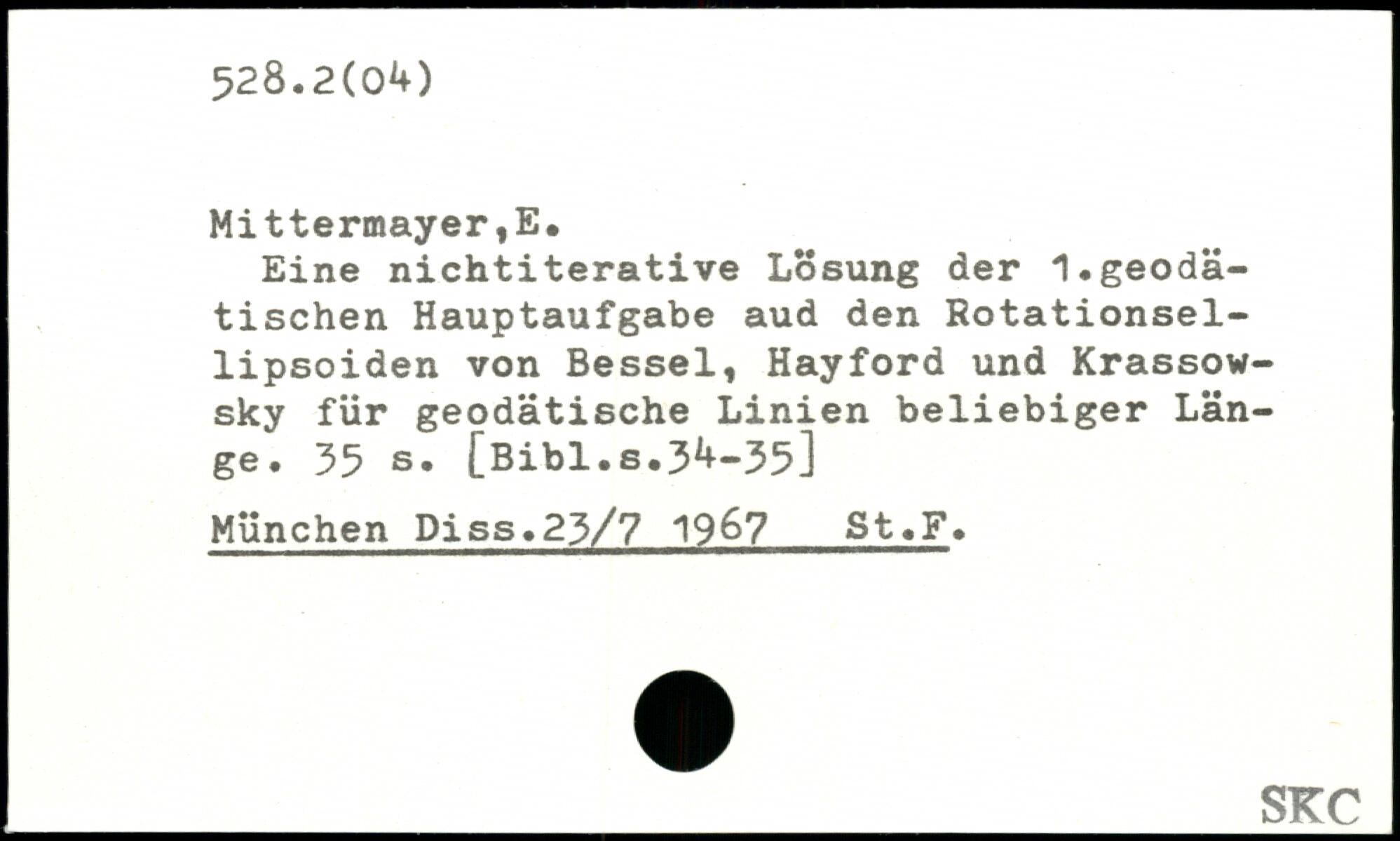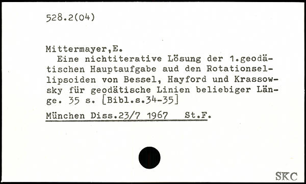 Eine nichtiterative Lösung der 1.geodätischen Hauptaufgabe aud den Rotationsellipsoiden von Bessel, Hayford und Krassow-sky für geodätische Linien beliebiger Länge.