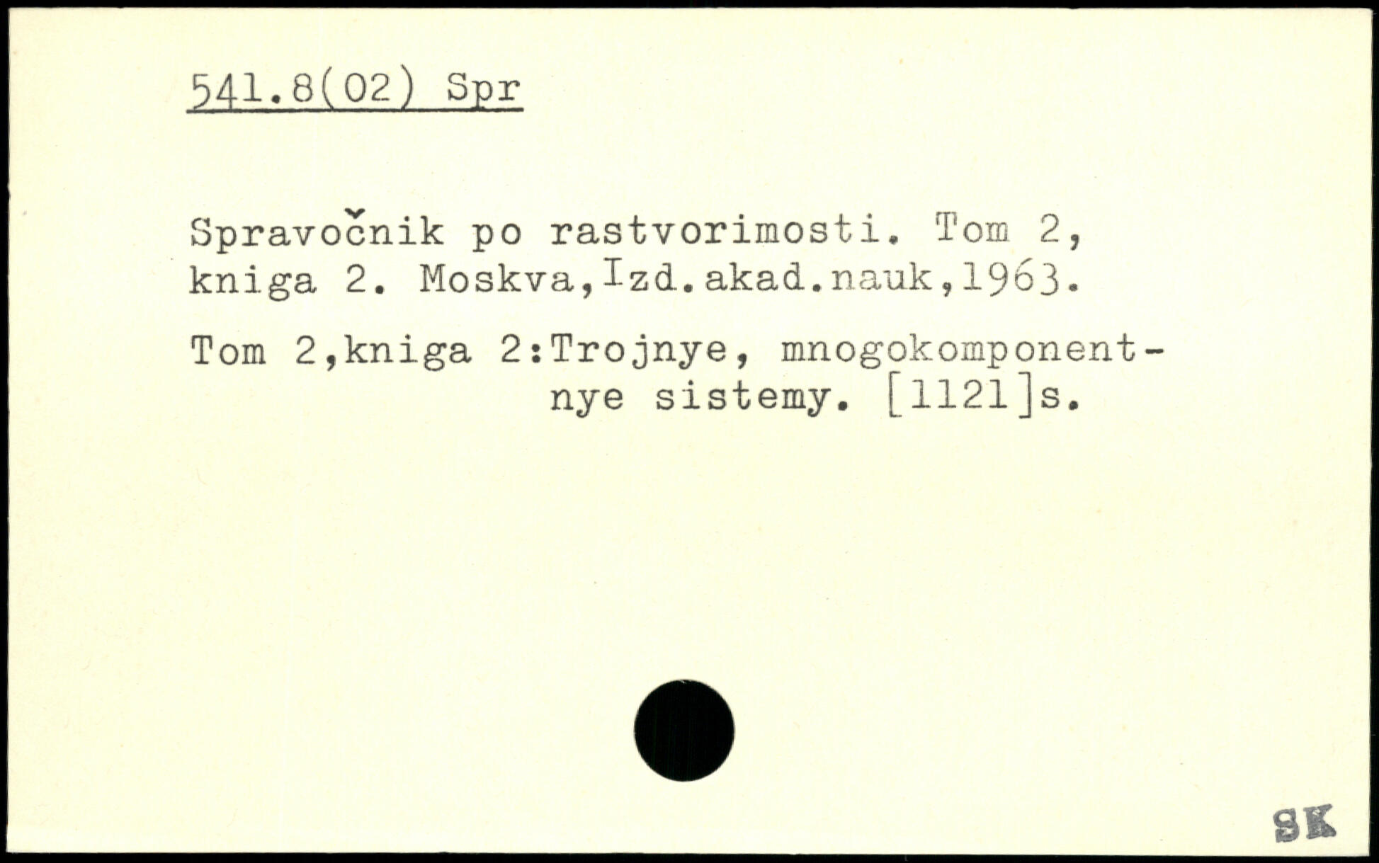 Spravocnik po rastvorimosti. Tom 2, kniga 2. Moskva,Tzd.akad.nauk,1963. Tom 2,kniga 2 : Trojnye, mnogokomponent-nye sistemy. [1121]s.