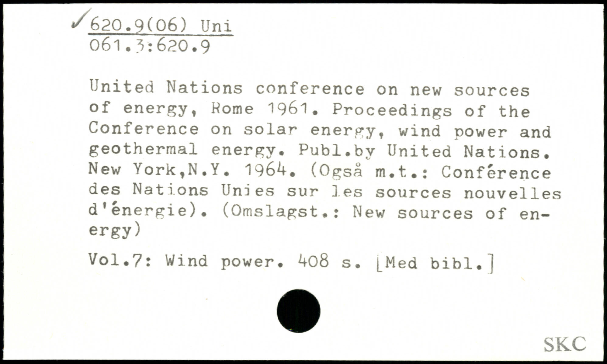 United Nations conference on new sources of energy, Home 1961. Proceedings of the Conference on solar energy, wind nower and geothermal energy. Publ.bv United Nations. New York,N.Y. 1964. (Ogsâ m.t.: Conference des Nations Unies sur ].es sources nouvelles d’énergie). (Omslagst.: New sources of energy)
